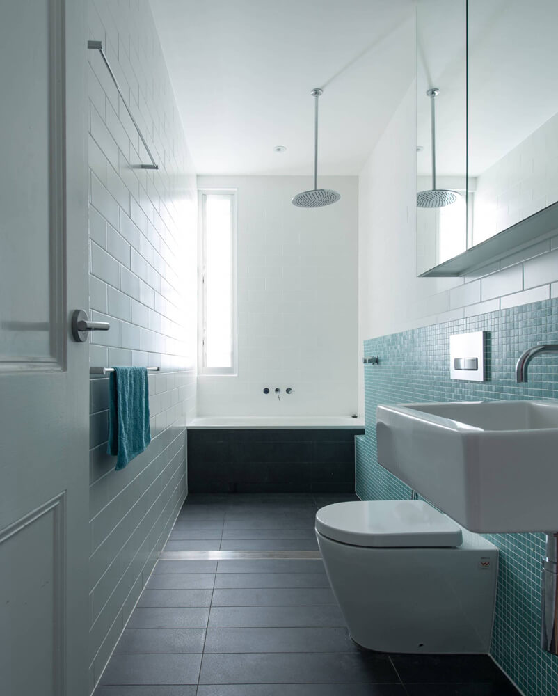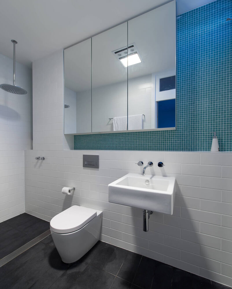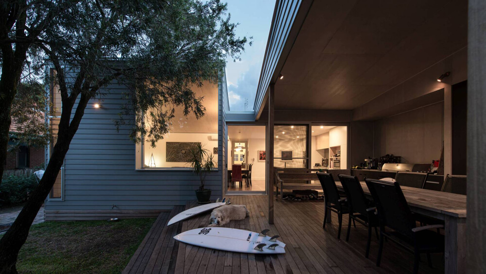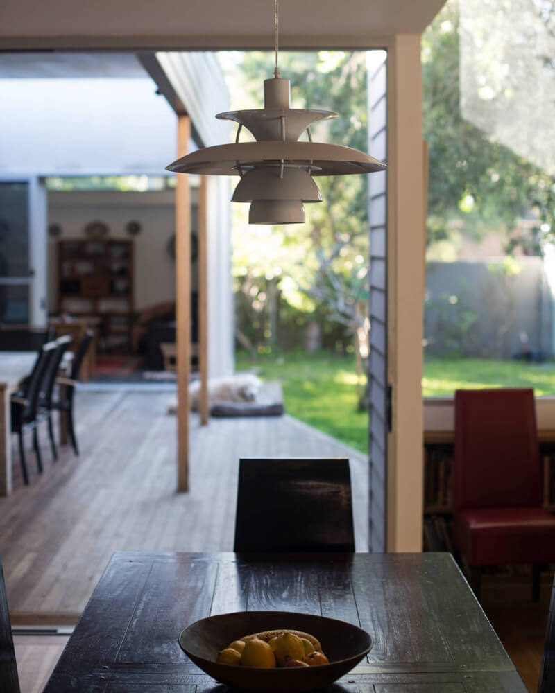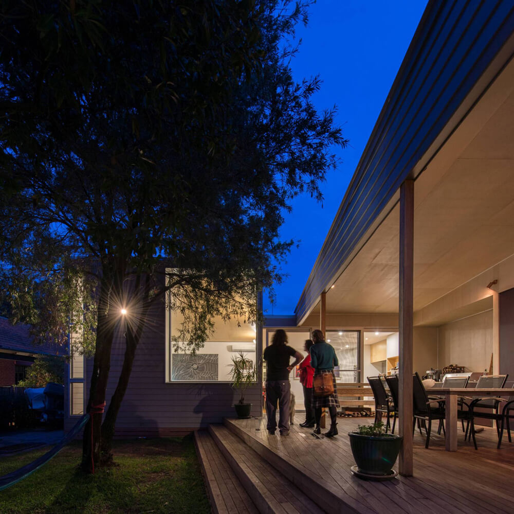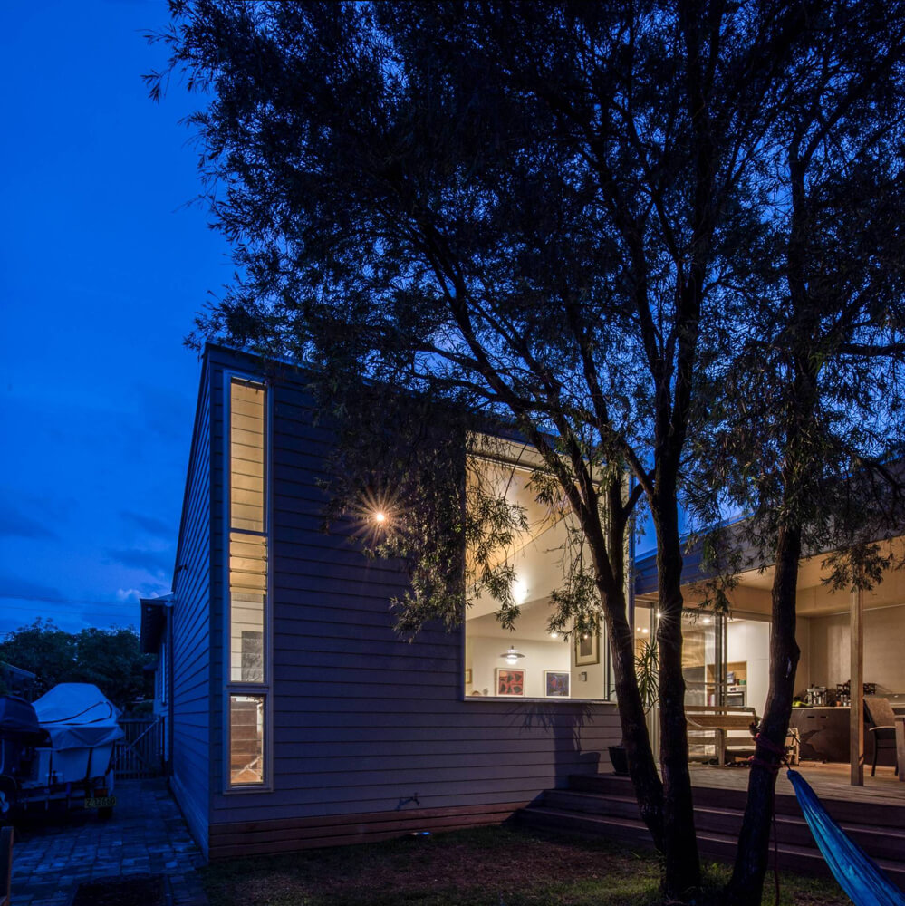 Roof water is collected in tanks for re-use on site. Hoop pine plywood is used extensively both as a joinery material and a ceiling lining. Lighting throughout is LED low energy. Flooring is clear finished timber. Cladding is painted timber weatherboard, colored darker than the original house to delineate new from old.