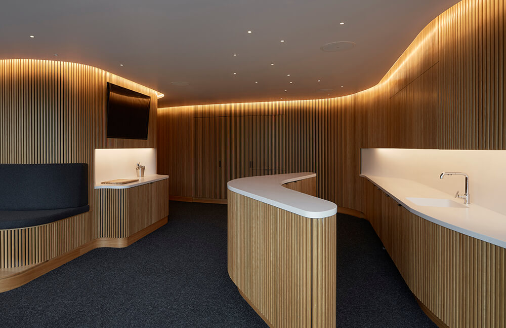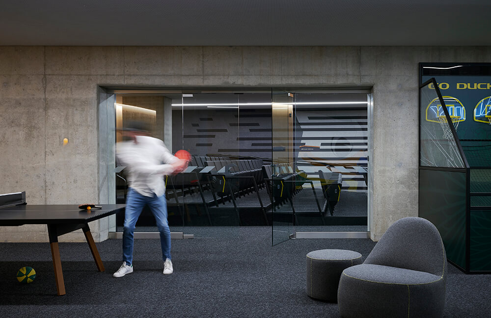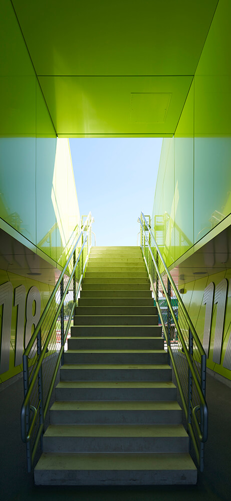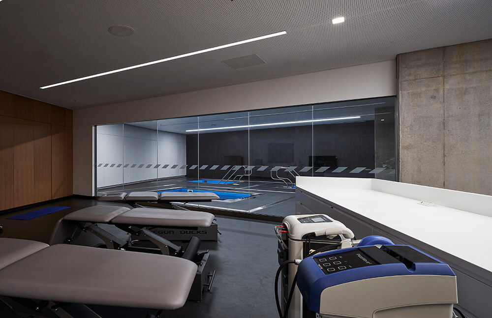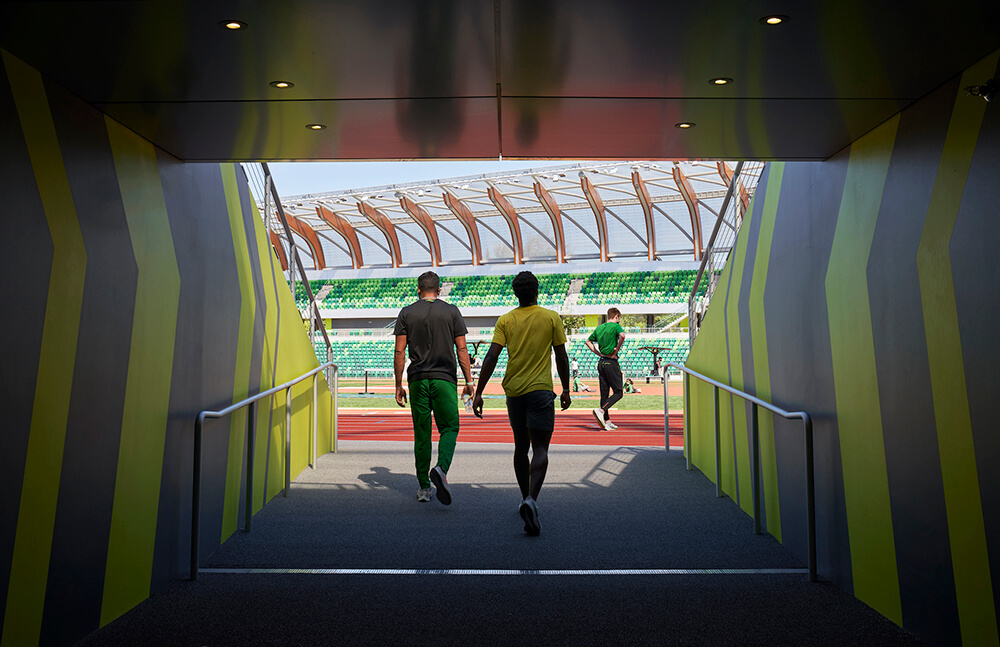 The 12,650 seats stadium (expandable to nearly 25,000 seats) provides world-class facilities for the UO’s track and field student-athletes to train, develop, and perform at their highest potential. All aspects of the stadium beyond the competitive track were envisioned to be used by the athletes for training-from the public concourses and ramps totaling 84,085 square feet, which are covered in track surfacing, to winding vertical stairs climbing the soaring Hayward tower. Beneath the stadium is nearly 40,000 square feet dedicated to training and recovery, including several amenities for the athletes to be social and come together as a team. Examples of these team amenities beneath the stadium include: an indoor practice area (including a six-lane, 140 meter straightaway and two-story interior space for long jump, triple jump, throws, and pole vault); 100-seat team auditorium; team locker rooms, lounge and shared study spaces; weight training; equipment work-space, offices, storage and check-out; sports medicine and active/passive recovery; hydrotherapy, training and treatment; anti-gravity treadmills; nutrition station; and barber shop. “Every inch of it can be used as a training facility, so no more having to schedule time or share facilities with other sports,” says SRG architect Whitney Ranson. “Anything that can be used as a training tool is used as a training tool.”