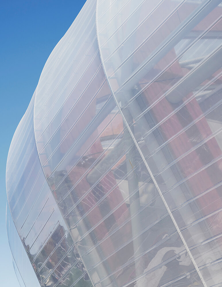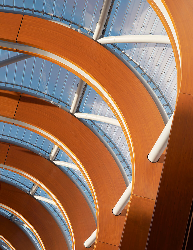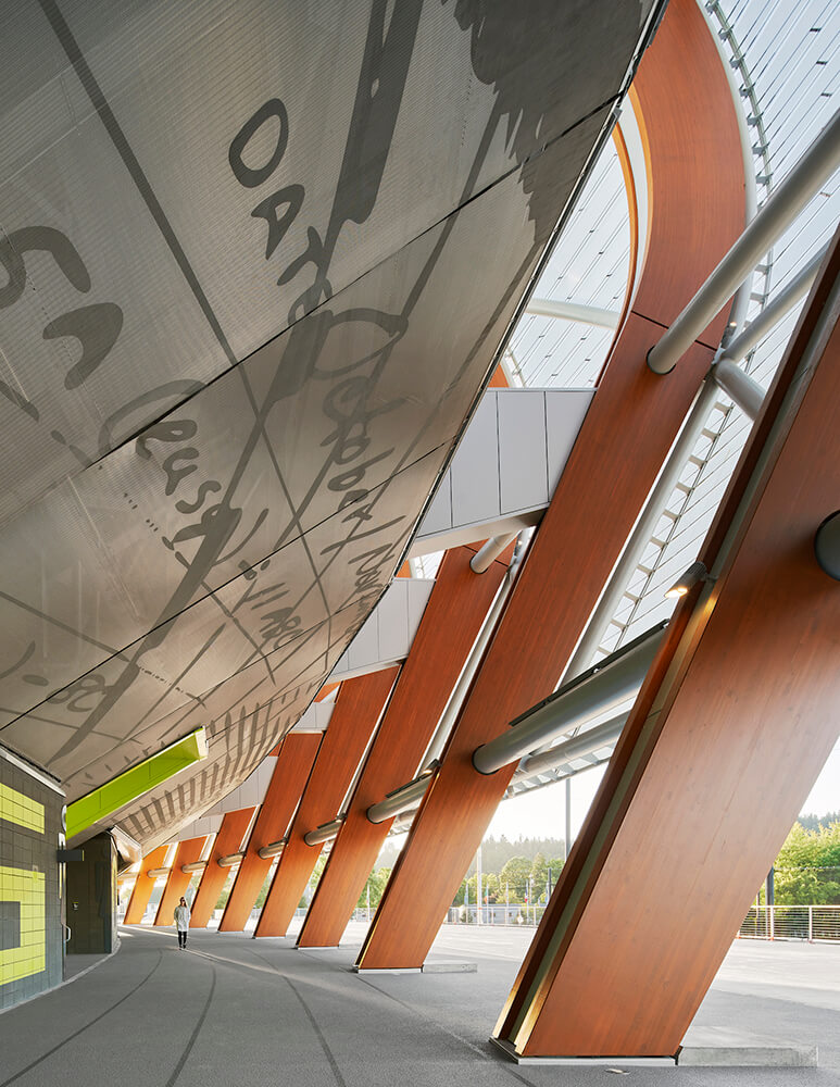 When first conceptualizing the new Hayward Field, the design team came across the quote, “Oregon is Wood and Wood is Oregon,” by Bill Bowerman, inspiring the heroic wood canopy structure and other wood elements throughout the stadium. The soaring canopy structure, or “bents,” surrounding the stadium are a powerful connection to Oregon and the Pacific Northwest. At the same time, this heroic scale structure is a physical representation of the most important aspect of the University of Oregon brand – innovation. Paired with the light, airy, translucent ETFE canopy roof, this environment enhances acoustics and provides rain protection and shade for the fans below.
