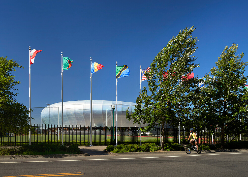 While track and field competition brings the fans to Hayward Field, there is more to experience here than simply the sporting events. Designed in collaboration with Gallagher, an 8,600 square feet museum dedicated to the history of Oregon Track & Field tells the story of Bill Bowerman and the birthplace of Nike. Inspirational graphics and monuments weave throughout the venue highlighting former Duck athletes and elements of the iconic Oregon brand. For example, the metal mesh that wraps the underside of the seating bowl highlights original sketches from Bill Bowerman, innovator and creator of the original Nike shoes. His historic statue is also located outside the museum, sitting directly on the track and the third curve, allowing him to “see” all the athletes who will run by him. Salvaged from the historic Hayward Field, plaques dedicated to Bowerman’s memory are located throughout the newly designed 15th Avenue promenade and at the gateway threshold from the plaza to the site. To commemorate the nations of athletes who have competed at Hayward, a dramatic procession of 156 flags line the perimeter of the south side of the stadium. Together, the people, stories, and elements of what has made Oregon Track & Field iconic and championship caliber through the years provides context to this special place and inspiration for young, aspiring student-athletes.