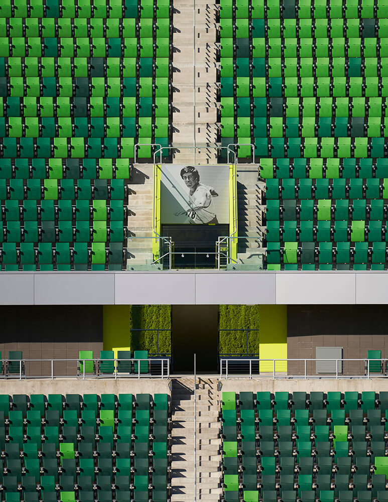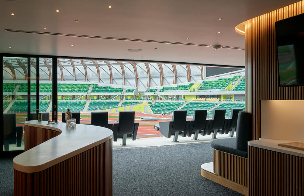 In addition to the athlete’s experience, the fan experience was paramount to the design. Open sight lines for all and the proximity of the spectators to the athletes-with the first row of seats on the new nine-lane track level-creates a unique intimacy between athletes and fans. The enhanced acoustics of the stadium help build anticipation and amplify the action, creating an immersive sensory experience. “We decided to go with a single layer of ETFE and stretch it taught, so it becomes kind of a diaphanous, simple form that sits on this solid masonry base,” SRG Principal Rick Zieve says of the stadium’s cladding. “It goes from more transparent down lower on the building to more fritted as you move up to the roof, so you get better shading. And ETFE is really a bright acoustical material, so it really helps reinforce and amplify sound. It was loud at Old Hayward, but there wasn’t enough enclosure to really amplify it.” Throughout the stadium all seating is a spacious 22 inches wide, with a generous 44 inch tread depth for optimum fan comfort. Making the stadium unique as a Track and Field only venue, the seating bowl is asymmetrical to pack the most fans near the finish line of competition. Unlike typical suites that are in lofty boxes above the stands, Hayward’s premium suites are open and close to the field, directly connecting fans to the action. “Track and field has the biggest competition surface of any sport,” says Aaron Pleskac, principal at SRG Partnership. “Would you rather watch the athlete throw [a javelin or discus], or where it lands? Pole vault happens in the middle. Some races start at the three-quarter mark instead of just running one lap. The stadium is a theater.”