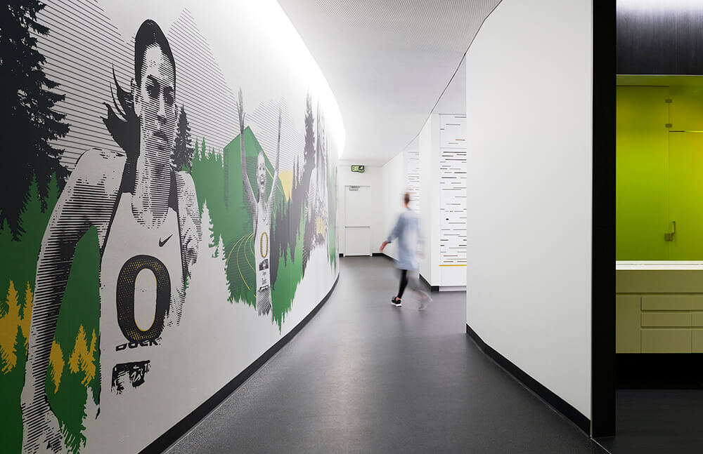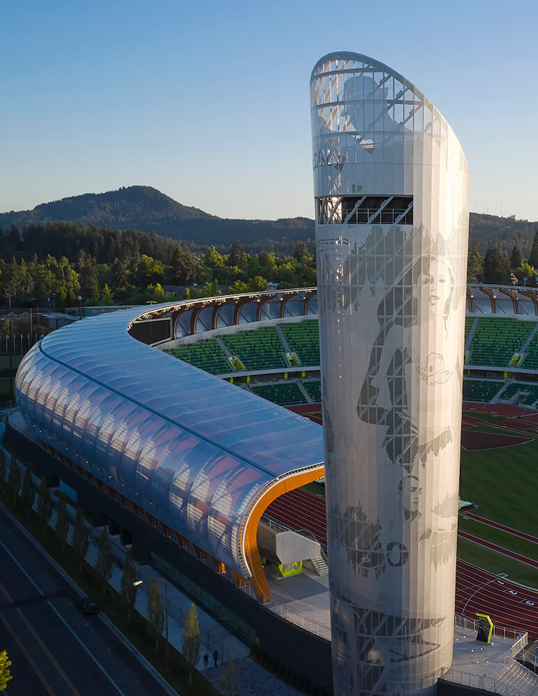 The 9-story Hayward Tower marks the main public entry and serves as a campus and community-wide landmark for this historic site. The interior includes coaches’ amenities, offices and meeting rooms and the open upper deck will be made public for all Hayward visitors to enjoy the 360 degree view of Eugene and the surrounding valley. The exterior is clad with a perforated metal panel featuring imagery of five Oregon track and field icons: legendary coach Bill Bowerman, Steve Prefontaine, Raevyn Rogers, Ashton Eaton and Otis Davis. The steel form flares upward and outward to resemble the Olympic torch, a fitting nod to the success Oregon Athletes have had and will continue to have on the biggest of competitive world stages.