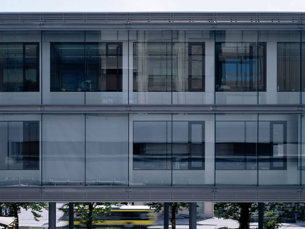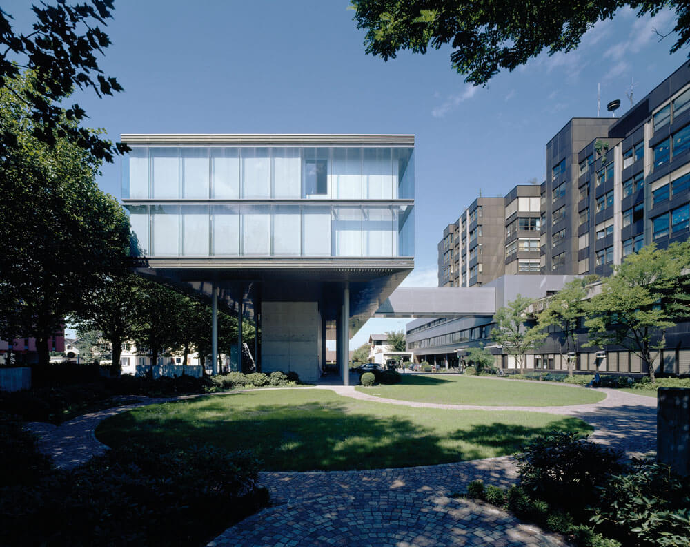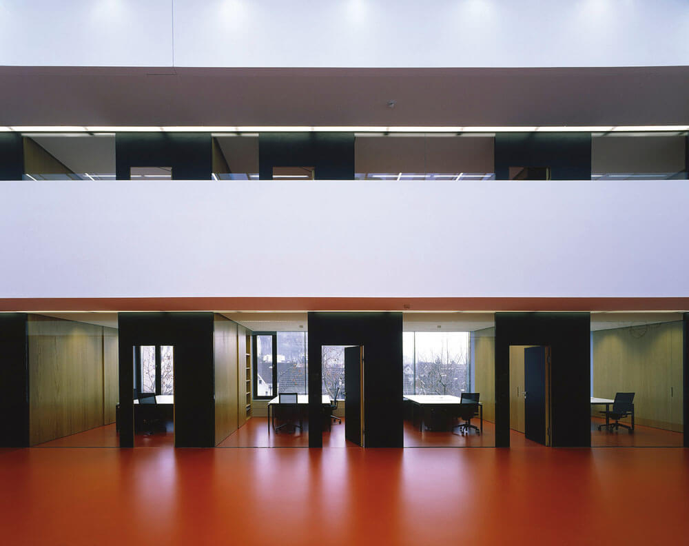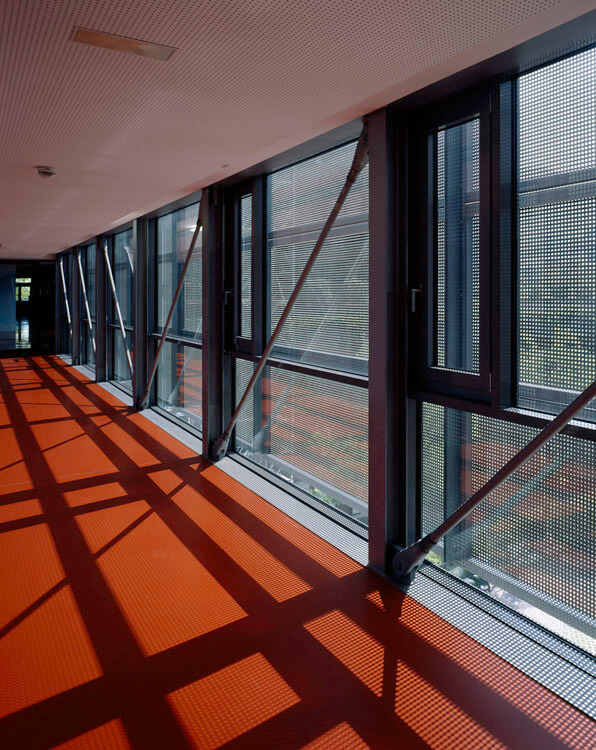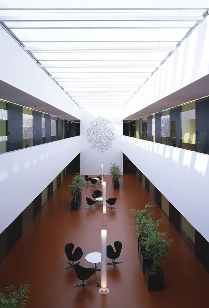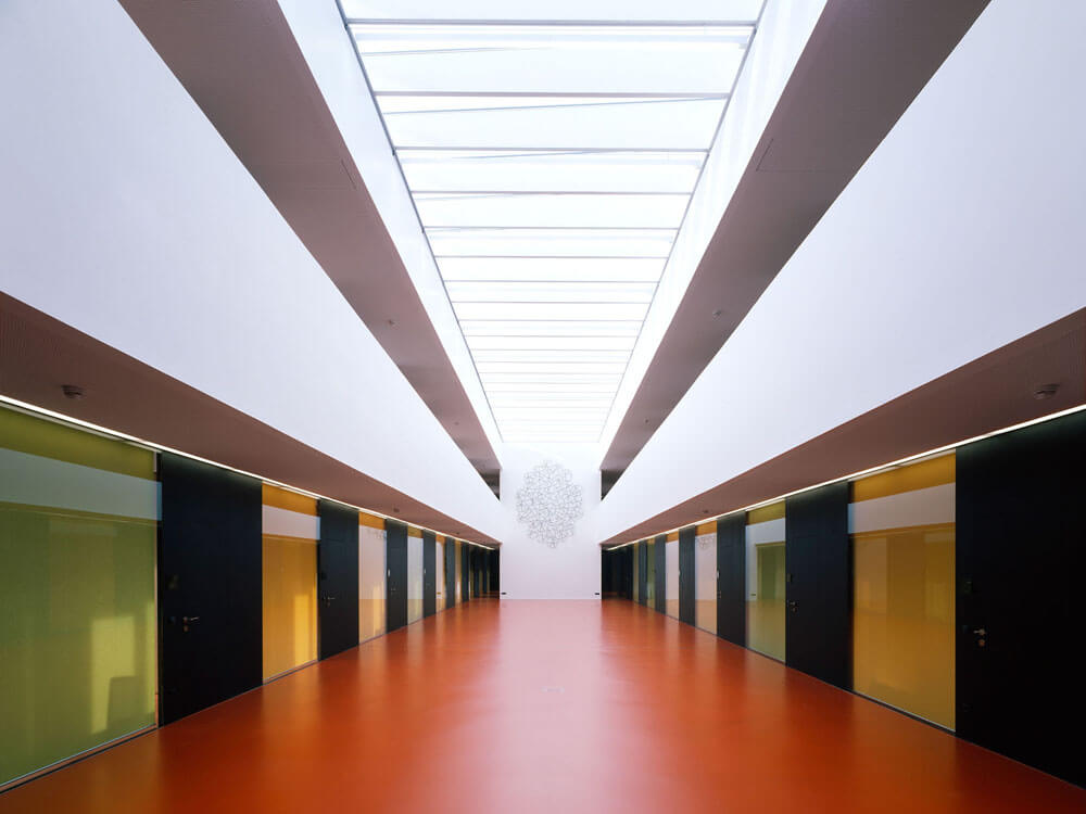 Actually two projects with separately masterful achievements. The addition first created new space through the use of a nearly undevelopable plot. First reduced down to the load-bearing reserves of an existing parking garage, two elegant levels of office space were created as eight-meter-tall steel constructions, and connected to the intensive care station with by a short footbridge. Set up in two sections, the presence of comprehensive medical technology is subtly complemented by highly developed lighting schemes and restrained natural and abstract images and a range of colors and materials, which stimulates the senses and increases well-being.