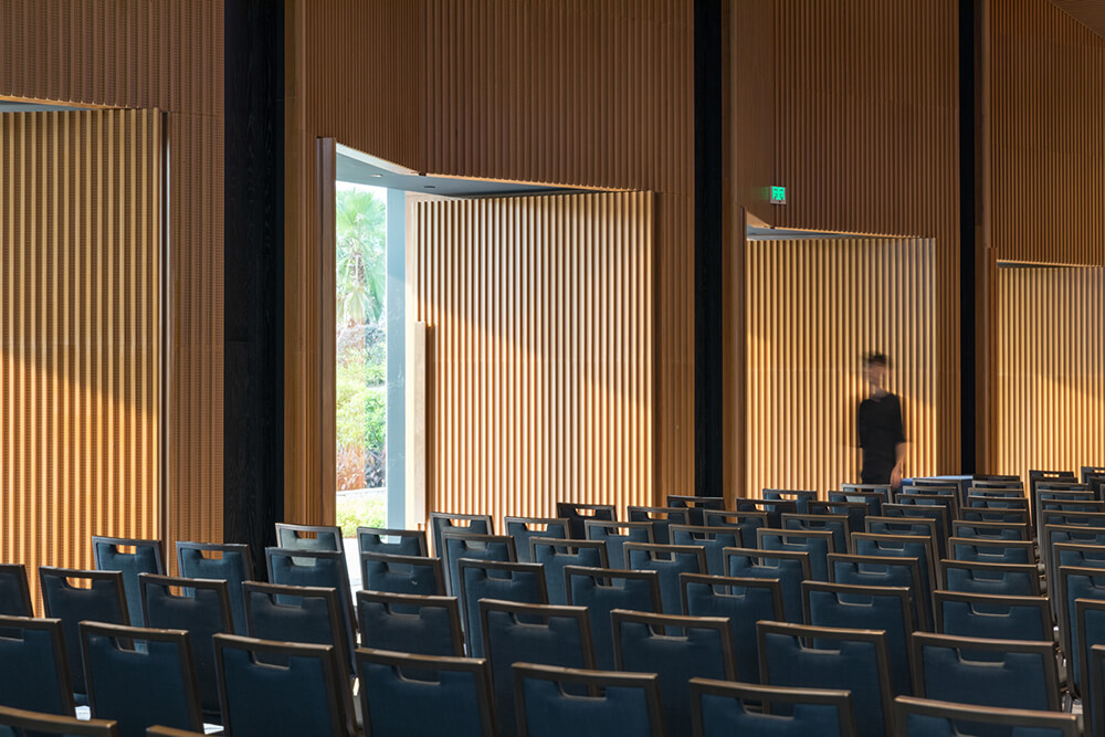 The banquet hall, primarily intended to accommodate special events, is designed to reflect a theatrical experience. Emphasis is placed on the choice of materials that intensify this feeling. Dramatic lighting, halo-like pendant lamps and fine linens followed by rich cedar wood used on both ceilings and wall panels represent a note of high luxury. Pivot wall panels stretch through the total height of the hall. They resemble fish gills and can be opened and closed according to need. The banquet hall facade, looking over the terrace, is lined with an outdoor reflecting pool that catches sunlight and reflects it back into the interior with glowing and shimmering effect thus intensifying a sleek sense of luxury during daytime.