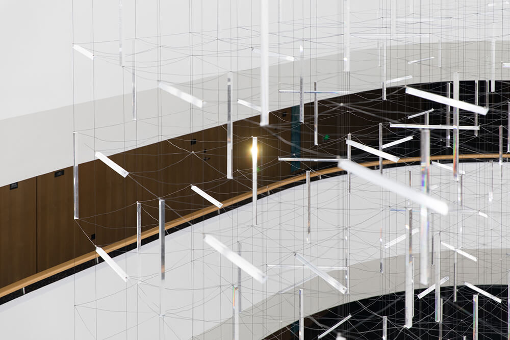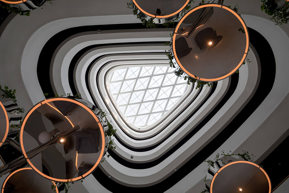 The central lobby, stretching vertically all the way to the top floors, features an art installation by Ivana Franke that fills out the empty space and intensifies the sensation of the elements: light, air, wind and water. Spaces with different uses and content are blended together by an organic flow and organization of different seating experiences, in groups that allow hideouts with small, intimate units formed according to the user’s needs.