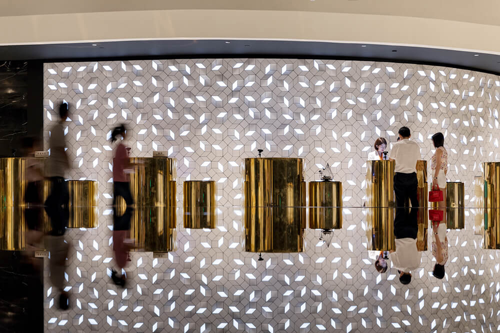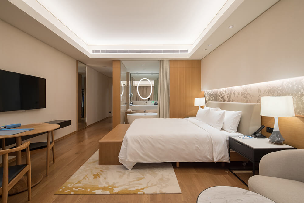 A uniform, streamlined facade defines the relation between rooms and exterior spaces, forming a continuous zone of terraces that protect the interior from the sun while keeping privacy between the levels of guestrooms and forming a distinctive hotel exterior aesthetic. The hotel’s volume and its’ mountainous effect are disintegrated with parallel horizontal lines of the façade that form an envelope which wraps itself around the building. The resulting play of light brings a balance into the environment, overlapping playful sequences of lines with the layers of surrounding verdure and reflective water surfaces. Hotels’ public spaces take advantage of the beautiful panoramic views on the surrounding Nansha Seaside Park and give the guests a sense of uncompromised luxury in a space well fitted into the nature around it.