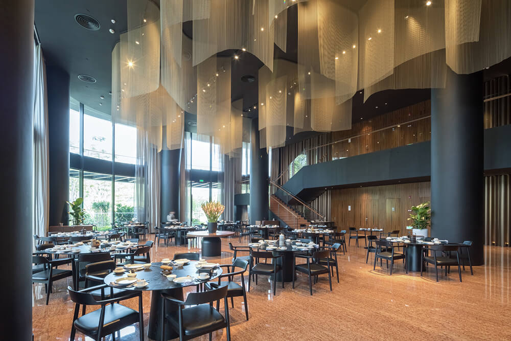 The Western restaurant is situated under the central lobby. It features seating arrangements set around and under a central square with trees. The main characteristic of the vast restaurant is a bilateral panoramic view complemented with the vertical central lobby and indoor vegetation.