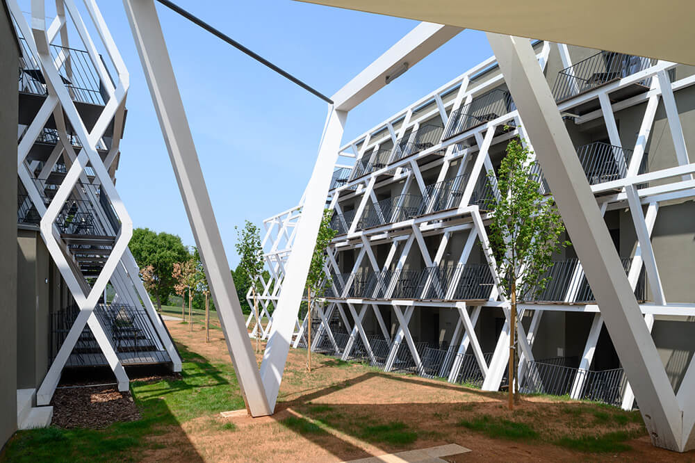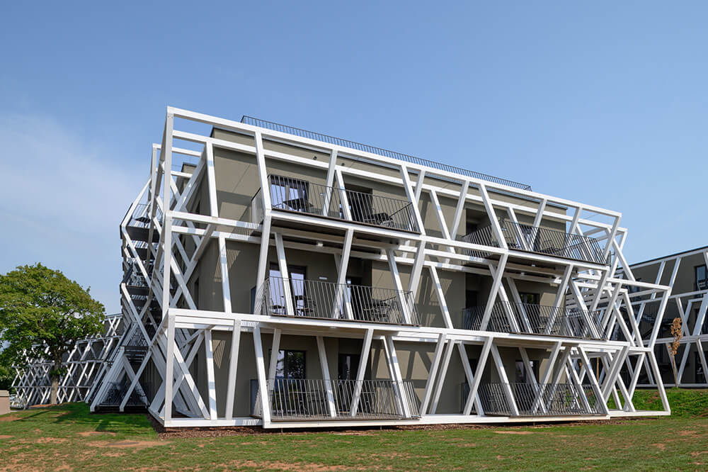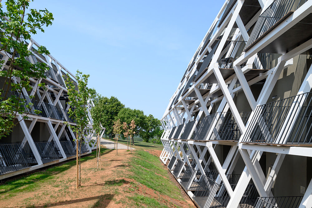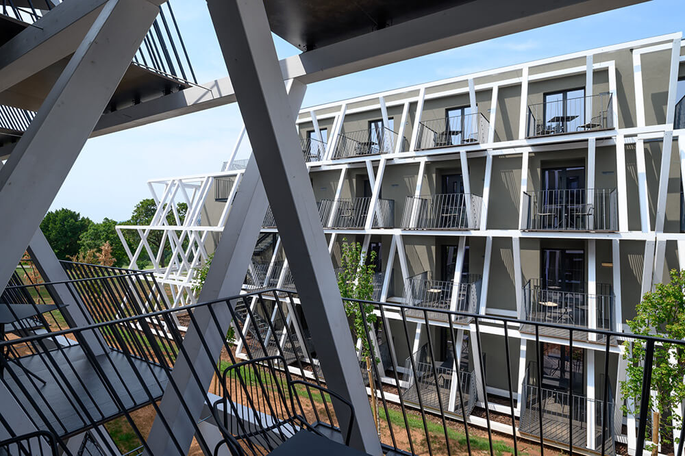 The fundamental guideline in designing the renovation and expansion of the hotel was to find a way to tone down the building’s presence in the space. Instead of the customary pursuit of the most appropriate appearance, the main consideration became the attempt at dematerialising the built masses. The proposed intervention proposes purging the hotel’s facade of all added architectural elements and unifying the structure’s expression by establishing a new, light load-bearing structure of the balconies, which have so far only featured on parts of the buildings. The new structural membrane enveloping the entire hotel and swimming pool area establishes a sort of an intermediate space between the buildings and the landscape. The interplay of light and shade breaks down the monolithic built masses and, together with the envisaged greening of the existing volume with climbing plants, dematerialises the building to the greatest extent possible and endows it with a distinctive and recognisable character.