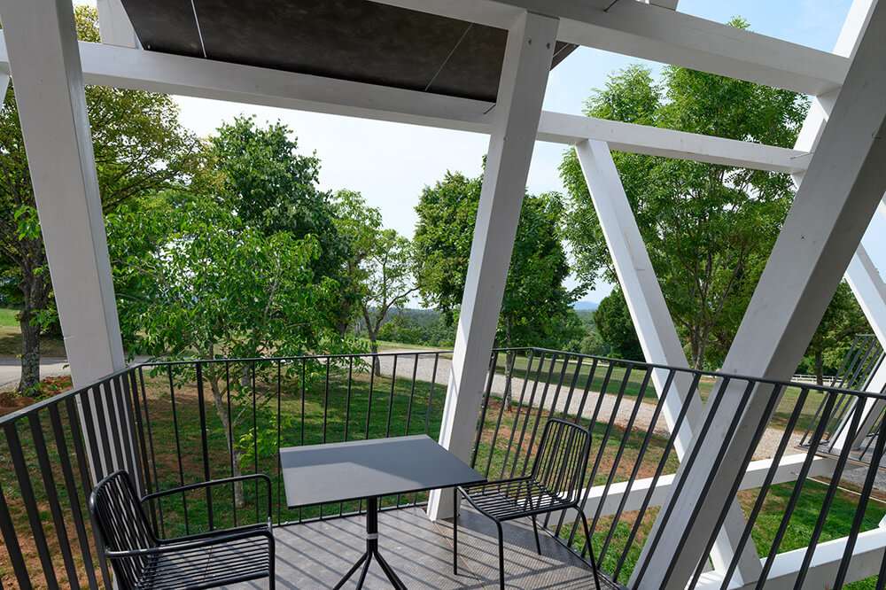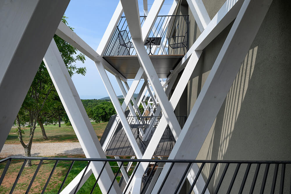 For the building to be better connected with the cultural landscape, the renovation intervention also envisages the elimination of the car park immediately in front of the building, transforming it into a park so as to gain the room for the expansion of the covered exterior programme terraces. All the eaves are also designed as a latticed structure of white timber glue-laminated beams, which provides an additional upgrade to the new, distinctly recognisable expression of the complex. The exterior paving is predominantly executed in compressed bonded sand, which softly links the function surfaces of the hotel with the laid out natural landscape of the stud farm.