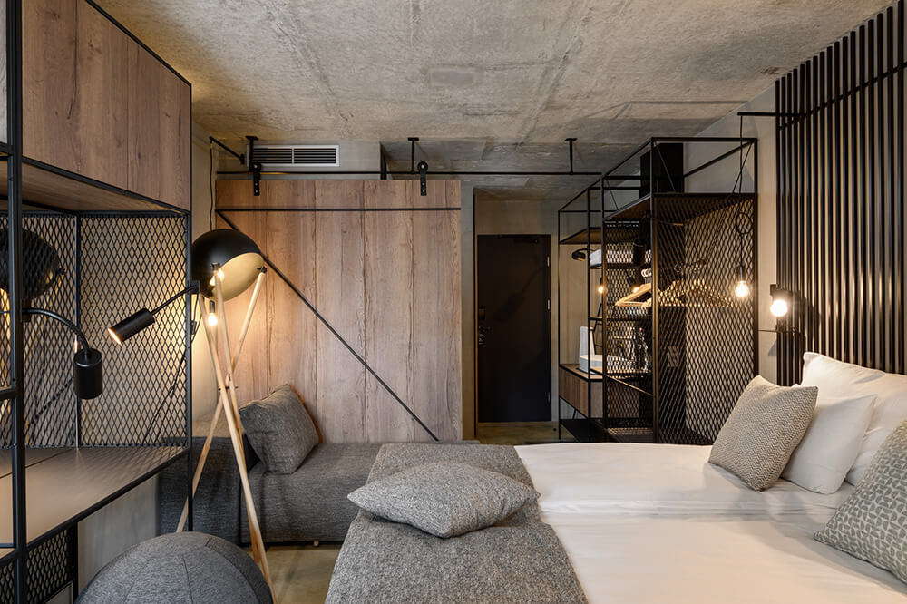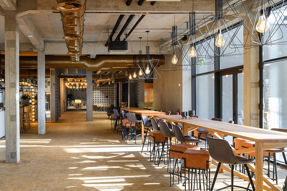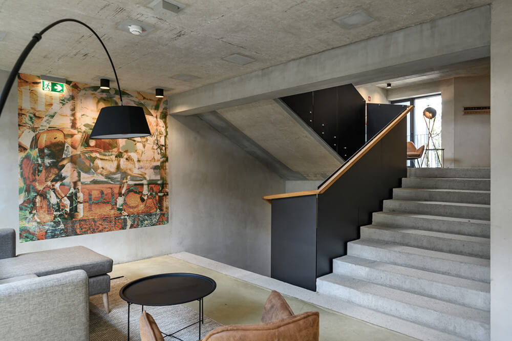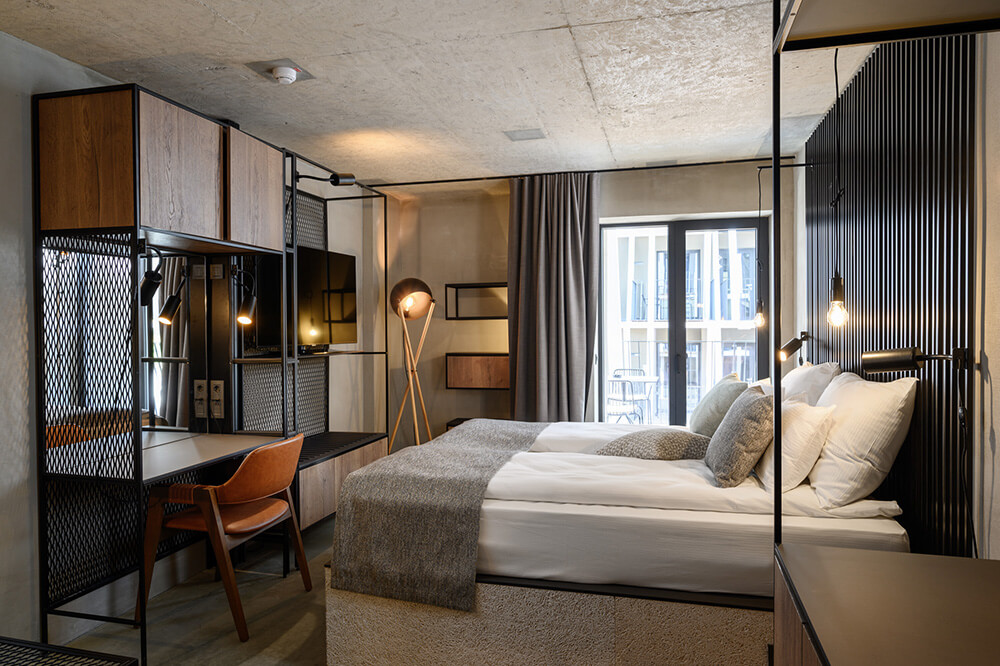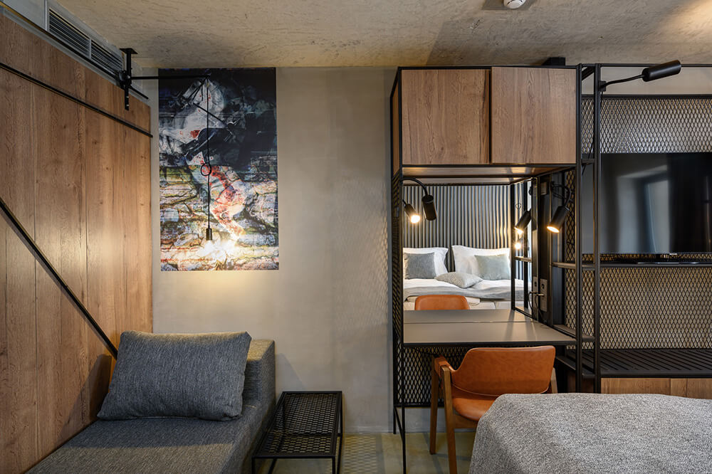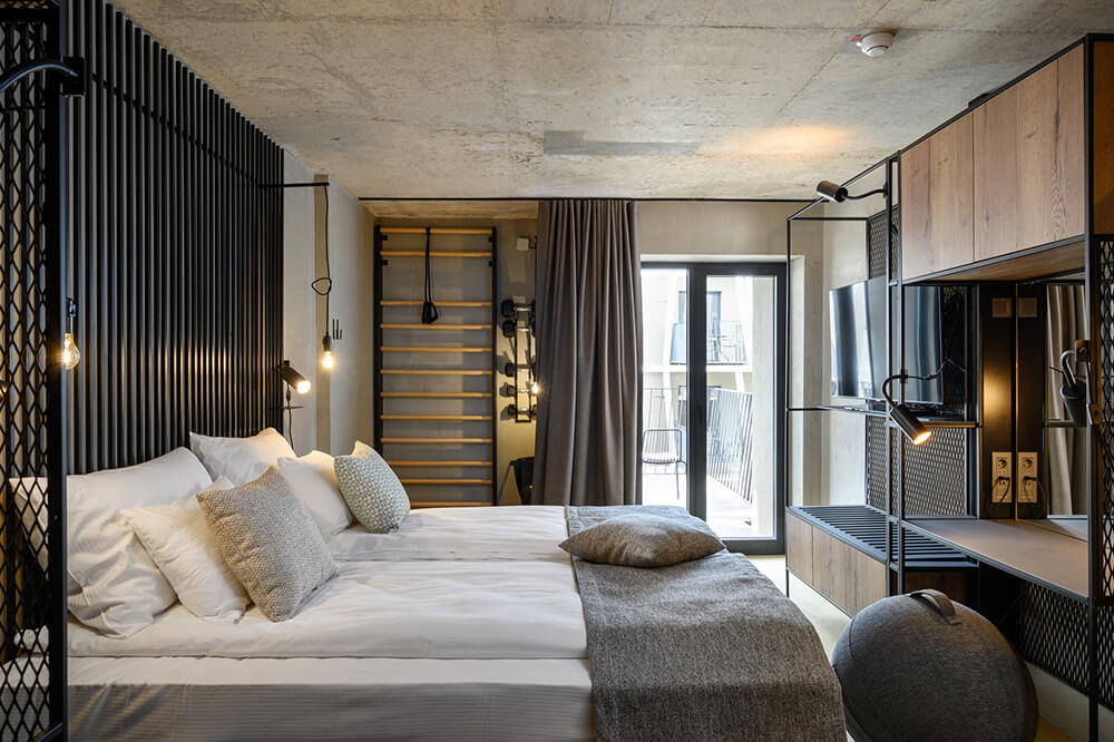The interiors of the renovated hotel and pool section are designed as a modern interpretation of the horse-stable interior spaces. As such, the public programme is designed as a particularly flexible space, which may be adapted depending on a given need using the folding partition walls. The existing buildings are stripped to the raw concrete structure, which remains visible and acts as a suitable frame for the minimal additional interventions ensuring a warm expression of the interior space. Combining the use of materials which the visitors associate with the materials used in the stables with the visible installations network without needless concealment mentally connects the interiors of all the stud farm’s buildings into a inseparable whole. The raw iron, timber boards, hay, the concrete floors in the rooms and the floors made of cut wooden dowels in the public programme combined with carefully designed lighting and small, movable pieces of furniture and decoration form a warm space, which becomes a logical enhancement to the complex’s unique programme and location.