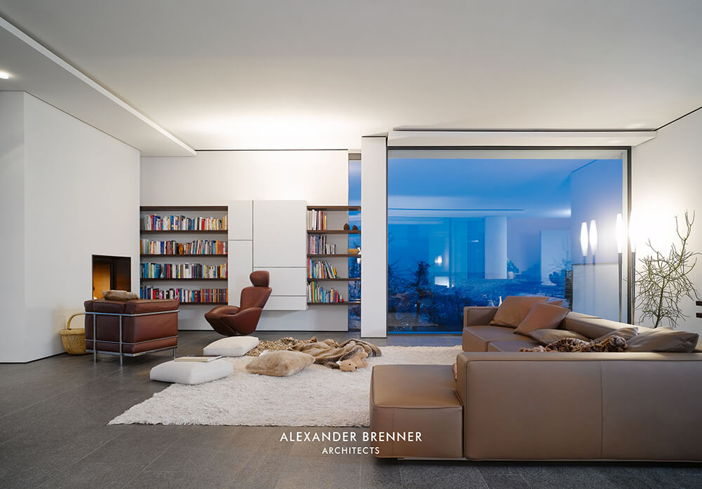 As you enter the house from the northeast via the two-storey entrance hall, the floor-to-ceiling glazing facing southwest opens up onto the garden. One can look out over the pool in front of the house, and across the valley towards the hills opposite. In this entrance hall (as in the whole house), visitors are aware of an interplay of open and enclosed spaces stretching between transparent expanses of glass and protective walls. This layout satisfies both the occupants’ need for security and, on the other hand, for openness and a connection with the surrounding natural landscape.