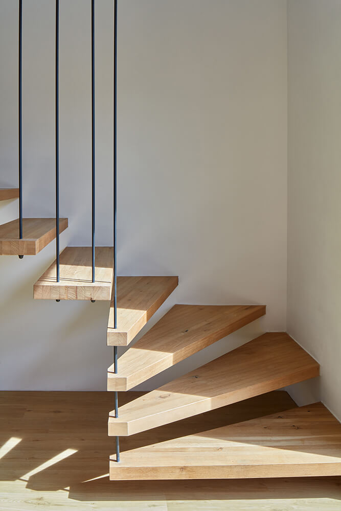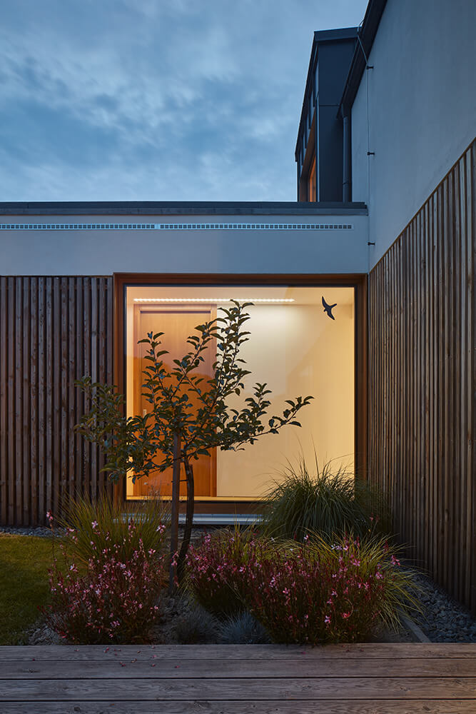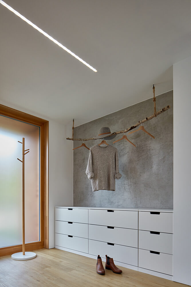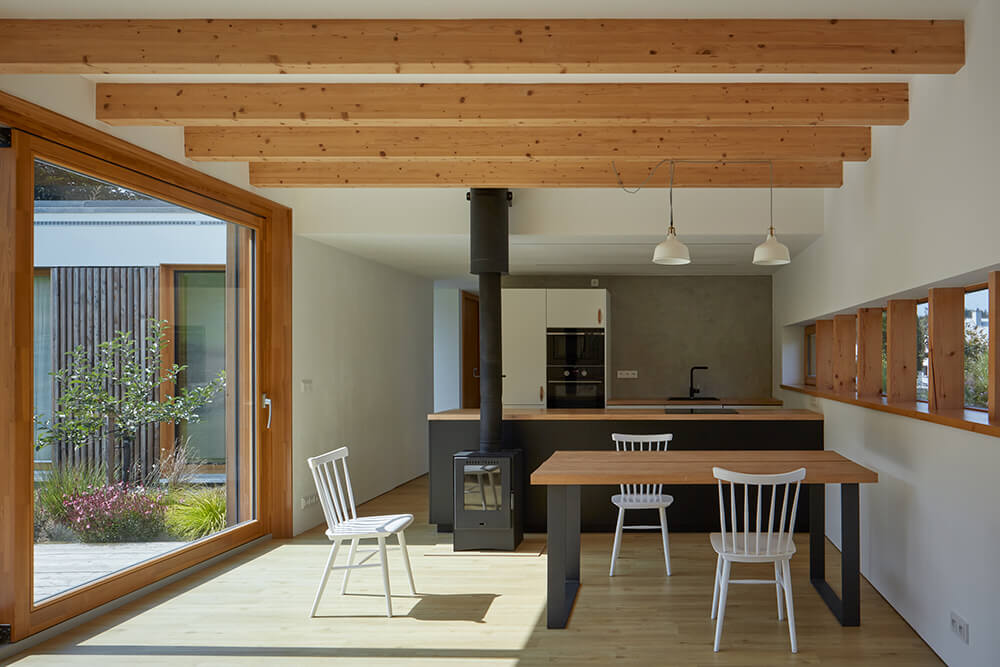 The layout of the ground floor is clearly divided into a common entrance area, which serves the needs of the family, and at the same time, it is the front area of the photographic studio located in the attic. There is a kitchen, dining room and living room in the main living area. A separate wing to the garden is the ground floor with the meadow on the roof. In the wing, there is a bedroom with a bathroom that is shared by the whole house.