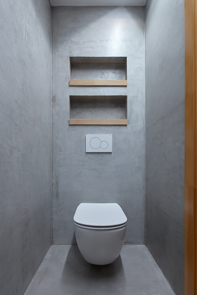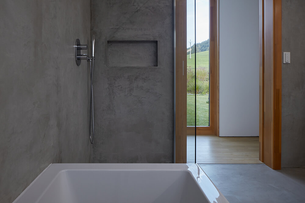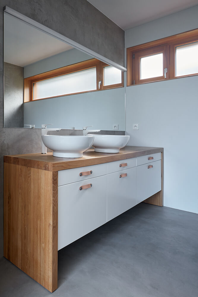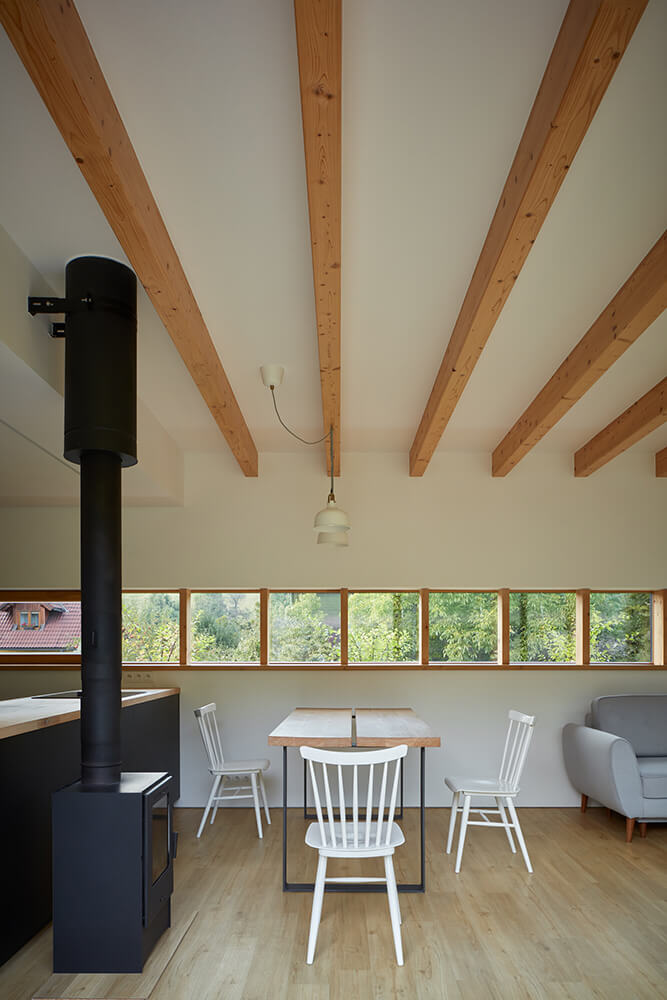 Creating a delicate transition between the socialist buildings and the pristine meadow was not easy. That’s why we chose the best of each element. From the existing construction the urban layout, especially the street line, and from the meadow the gentle curves of the terrain. We extended the meadow up to the roof of the bedroom and erased the boundaries between the terrain and the house. The absence of fencing only supports the natural setting of the house in the surroundings.