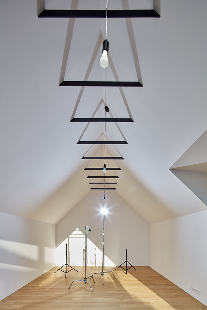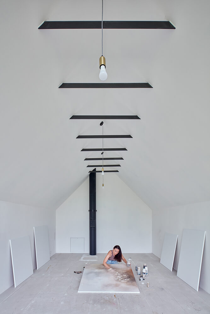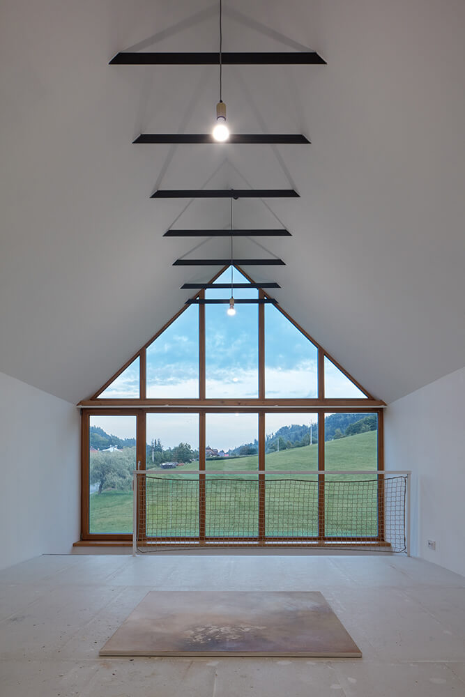 The attic is divided in half. One part belongs to the studio with an exit to the green roof-meadow, the other is completely under the domination of children, who have a view of the Wallachian hills through the glass gable.