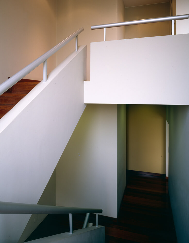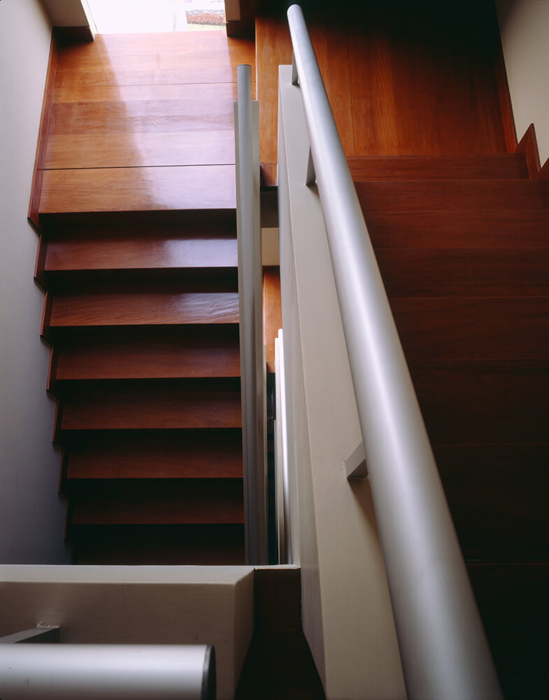 The project solves the task from a conceptual planning viewpoint that organizes the program into three boxes joined together three dimensionally at 90 degrees. The first contains the main vertical circulation, the second, parallel to the street, the bedroom and family room, while the third, perpendicular to the land, contains the main room and projects outwards to the front space of the home. The rest of the program has been arranged into a sort of background wall and other secondary volumes.