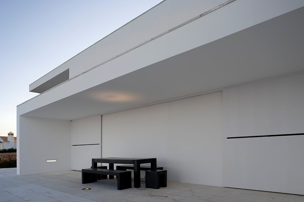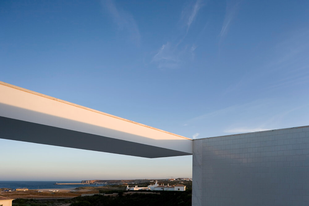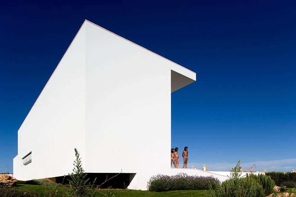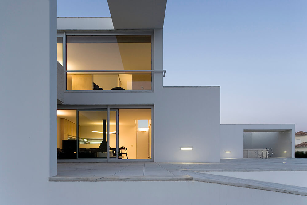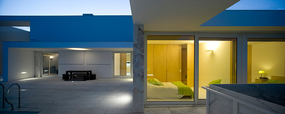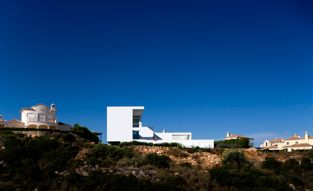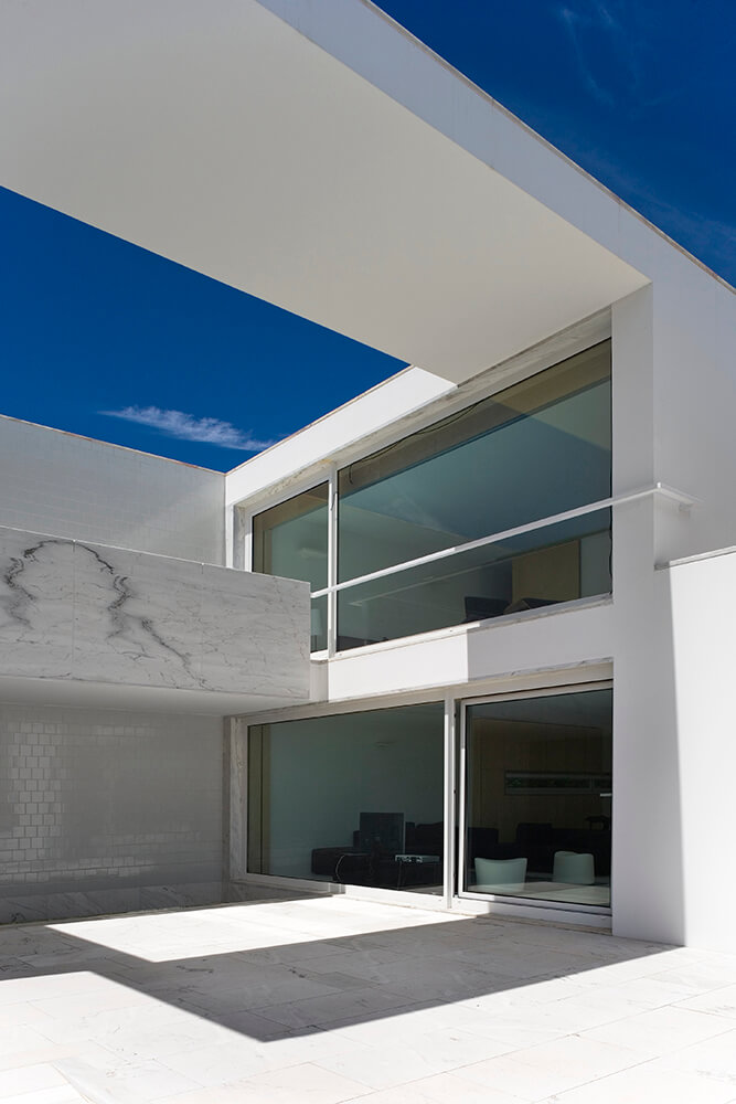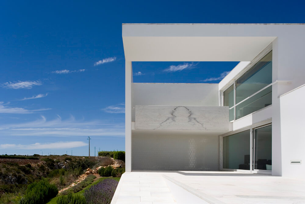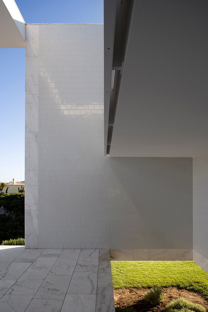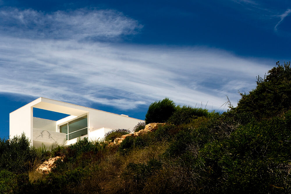 Inside-outside spatial relationships are articulated through the tiled court-yards, protecting the large glazed windows from the strong direct sun light, while filtering and reframing fragments on untouched landscape. On the exterior, the house life leans over the nearby valley. The white house with flat roofs, recovers ancient local architectural typologies, where fruits and fish were dried on terraces, a feature that touristic developments seem to forget.