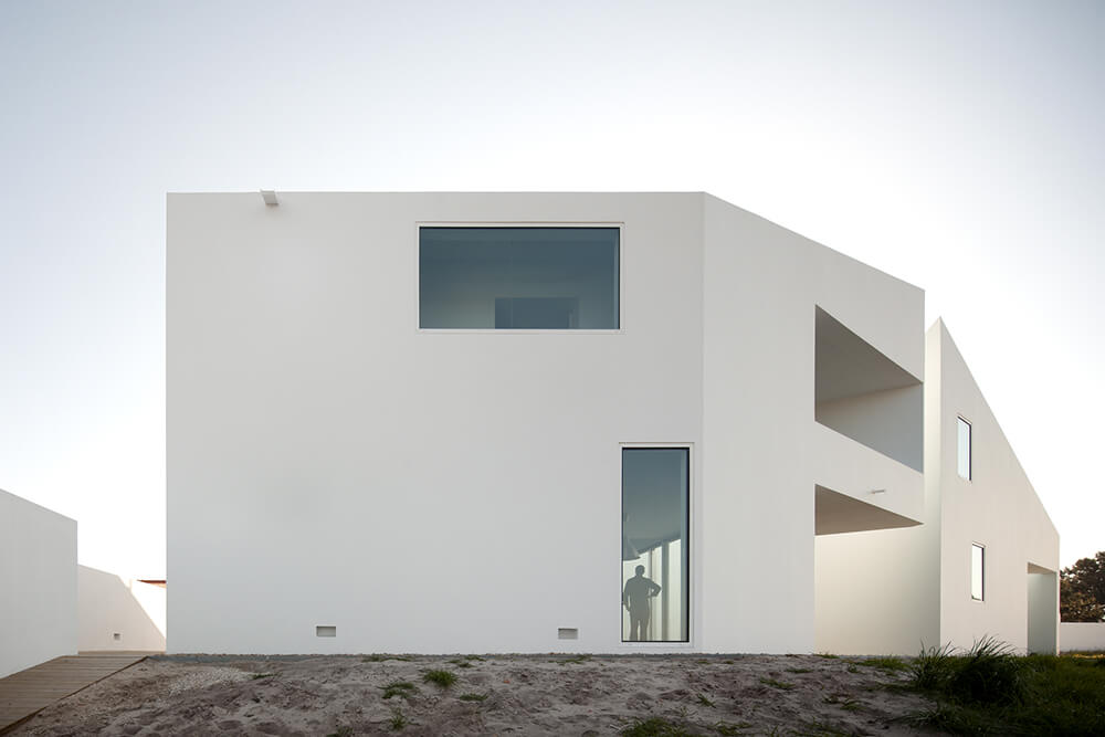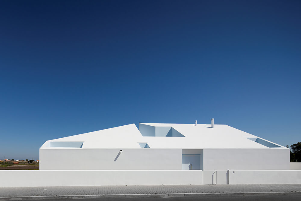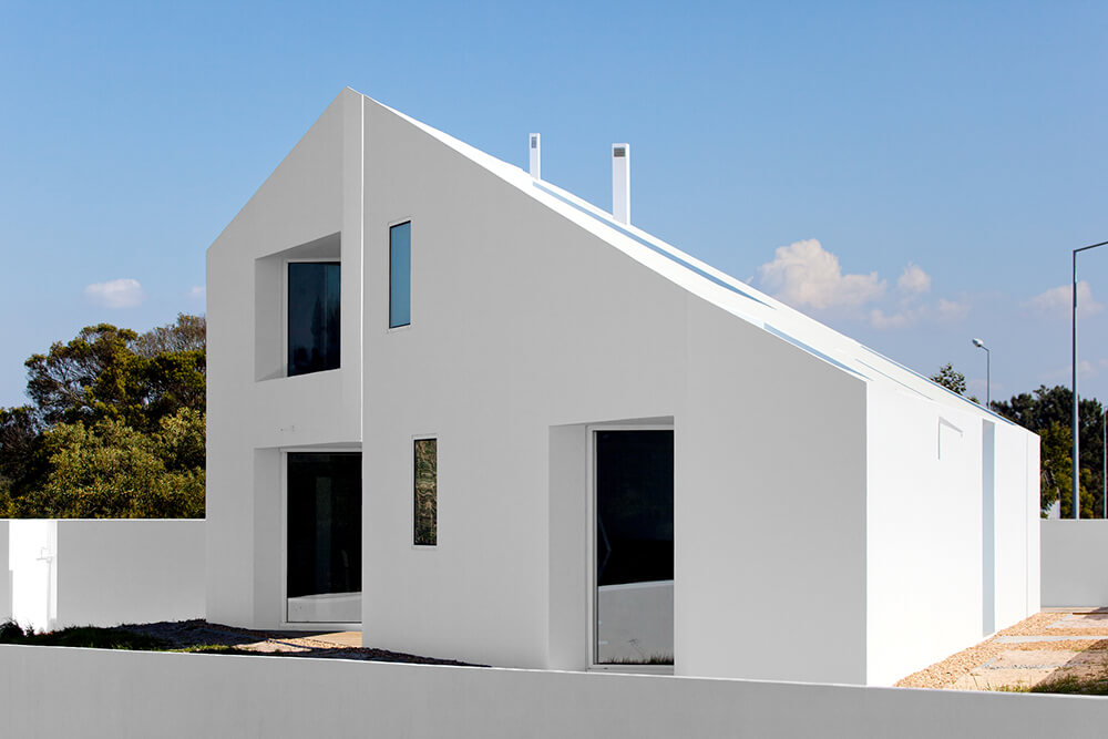 The implantation terrain of this small house, located in the village of Possanco, sets the transition area between the new urban strip and the protected agriculture zone. An extensive northbound plain ends far away at the splendid Arrabida mountain ridge. Sparse water spots of the river Sado spreading, and the Atlantic Ocean defining the horizon complete this scenario of a bold pictorial expression.
