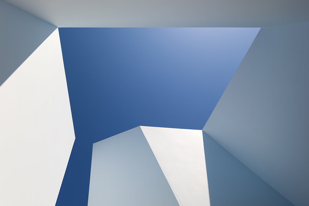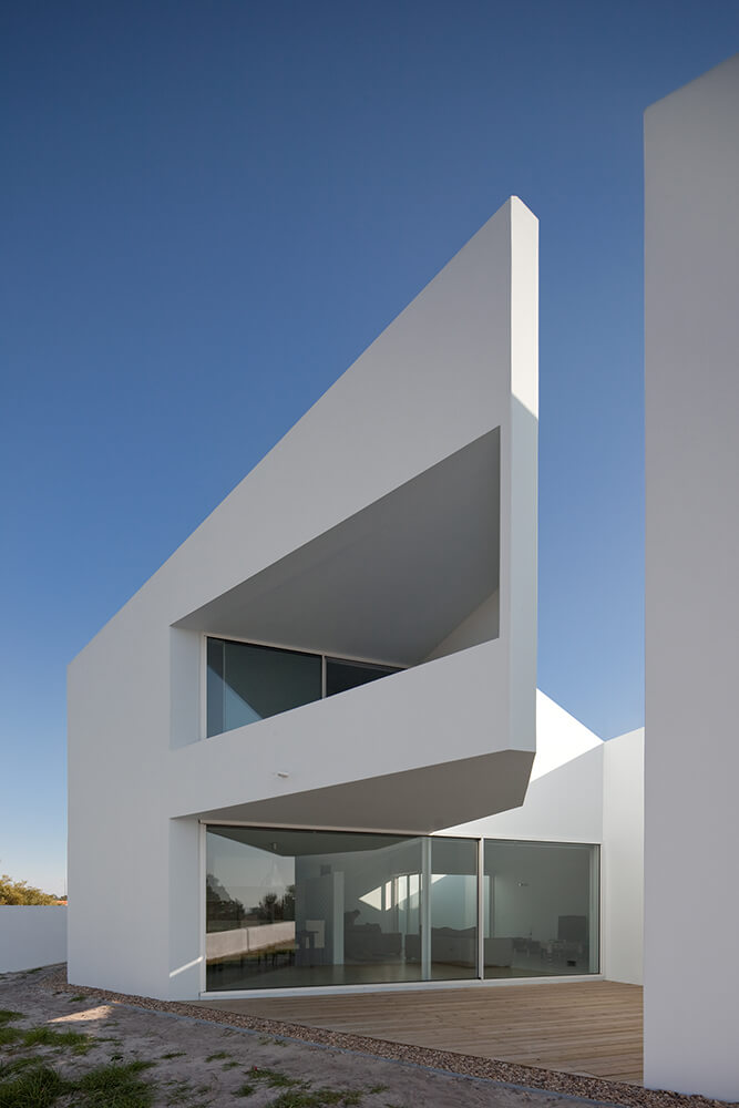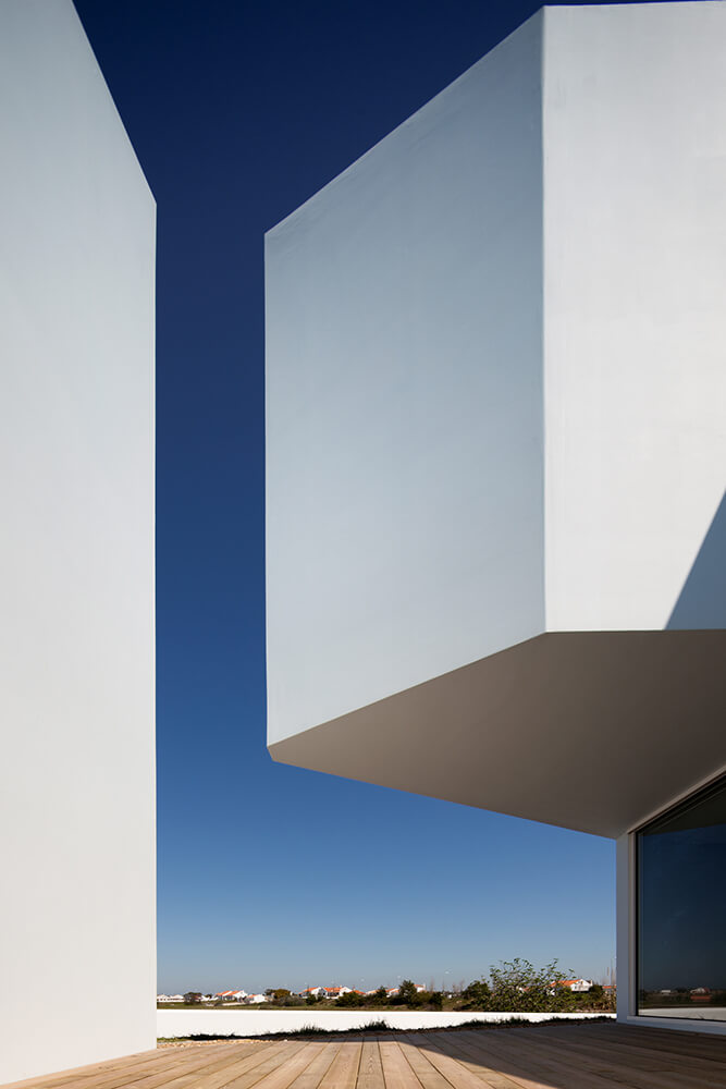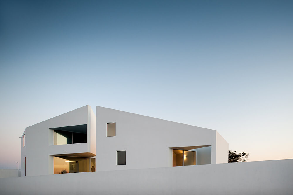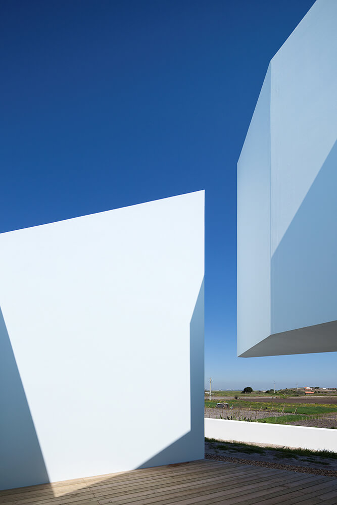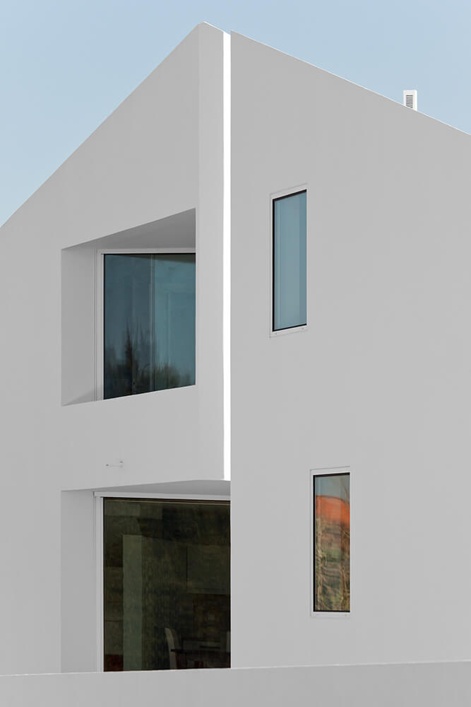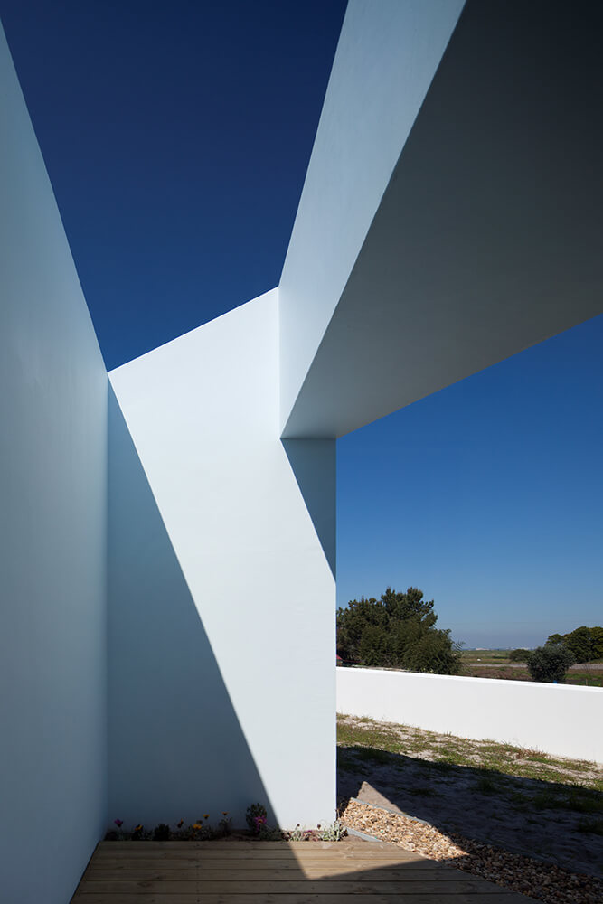 In order to receive natural light to the south, we introduced in that long plan 4 patios: a central one, one in the living-room, one in the social toilets and a final one near the children’s room. Almost all situated north, the windows guide the views to the amazing landscape. We explored the expressiveness of the white block and its abstract personality. The totality of the volume would be white, roofs included, where the patios resemble bluish excavations, enhancing delicately the strong character of the house. In fact, the building is done almost exclusively with the Alentejo repertoire: white matter, light-shade, thickness/mass, texture.