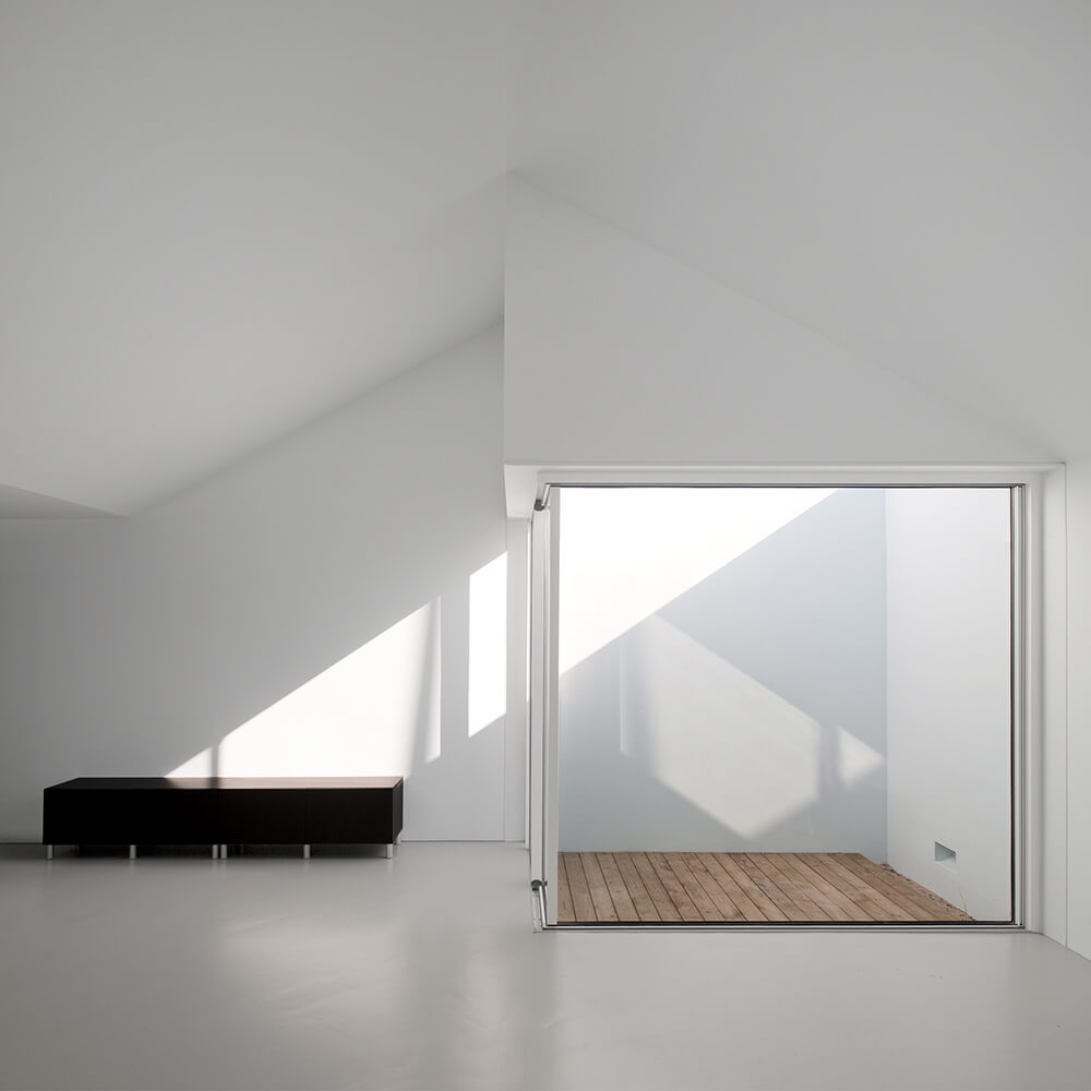 Indoors, rooms occur in between “suggestions” of the traditional two-garret volume, and variations in scale and depth transform in each chamber the atmosphere of that inner world intentionally sober. In the middle of the living-room, the kitchen-island takes on the ancient role of the fire as a centre-piece of the home, around which everything comes to place.