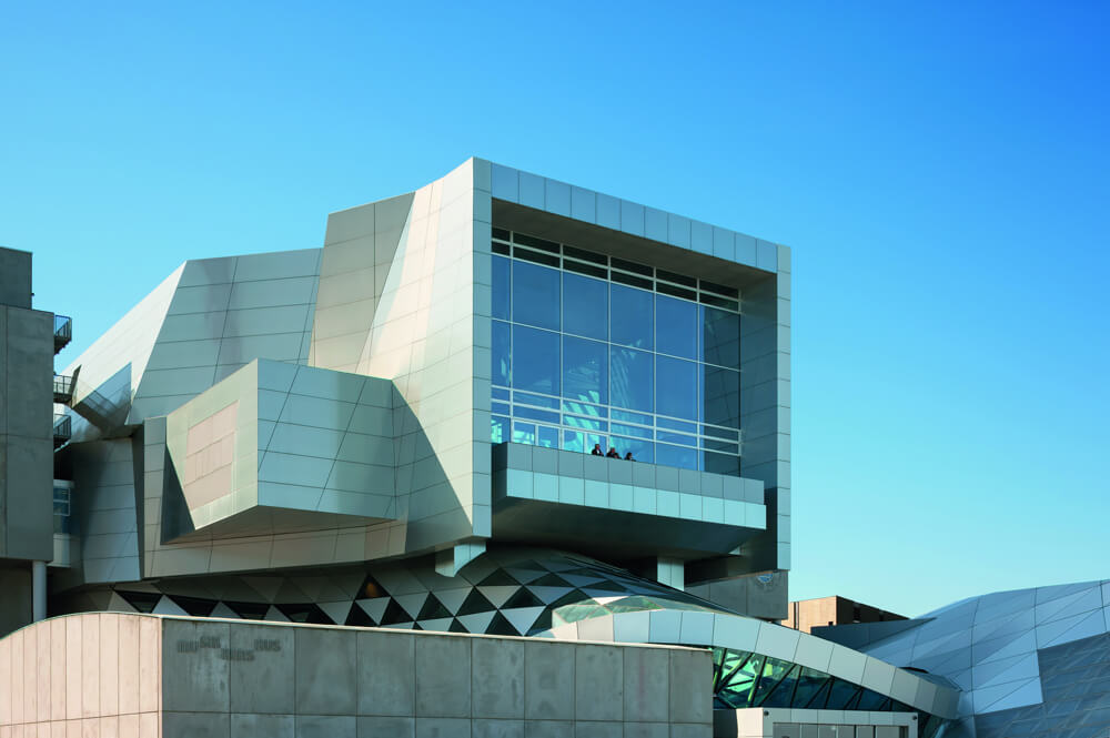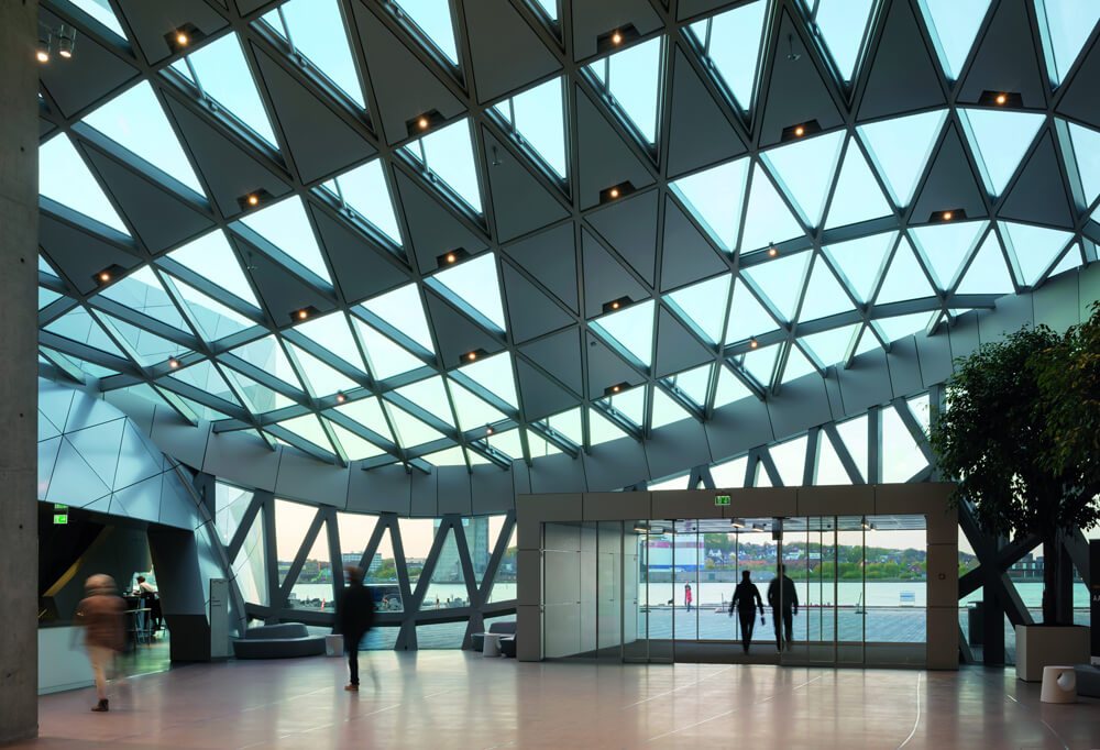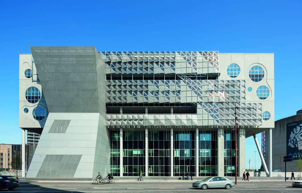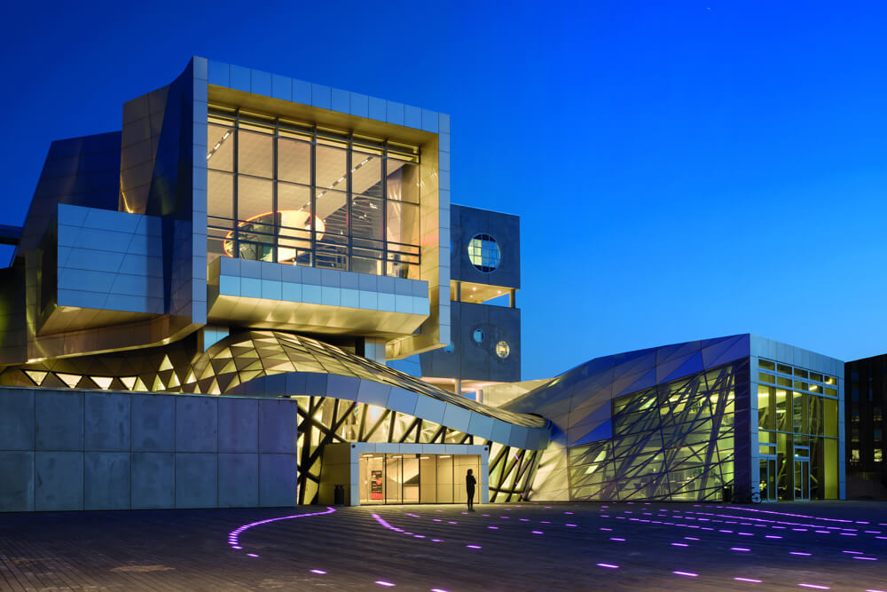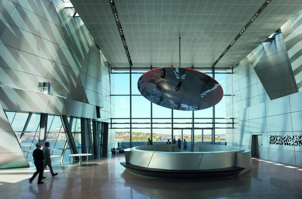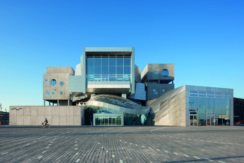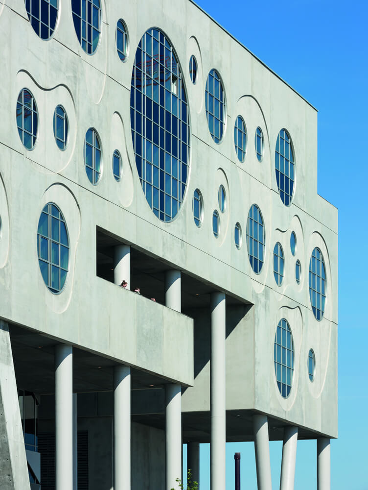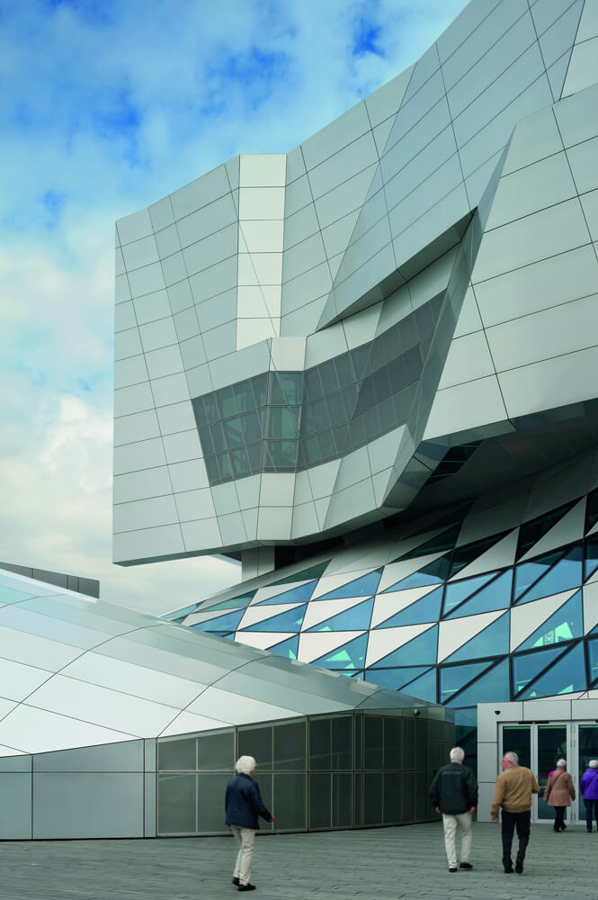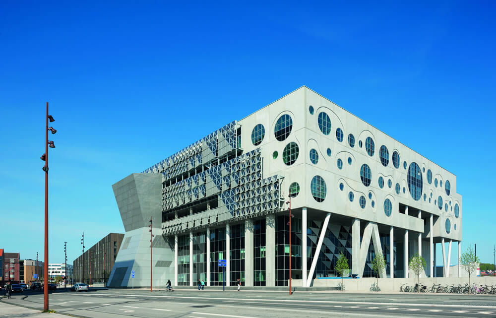 The “House of Music” in Aalborg, Denmark, was designed by the Viennese architectural studio Coop Himmelb(l)au as a combined school and concert hall: its open structure promotes the exchange between the audience and artists, and the students and teachers. “The idea behind the building can already be read from the outer shape. The school embraces the concert hall,” explained Wolf D. Prix, design principal and CEO of Coop Himmelb(l)au.