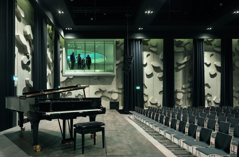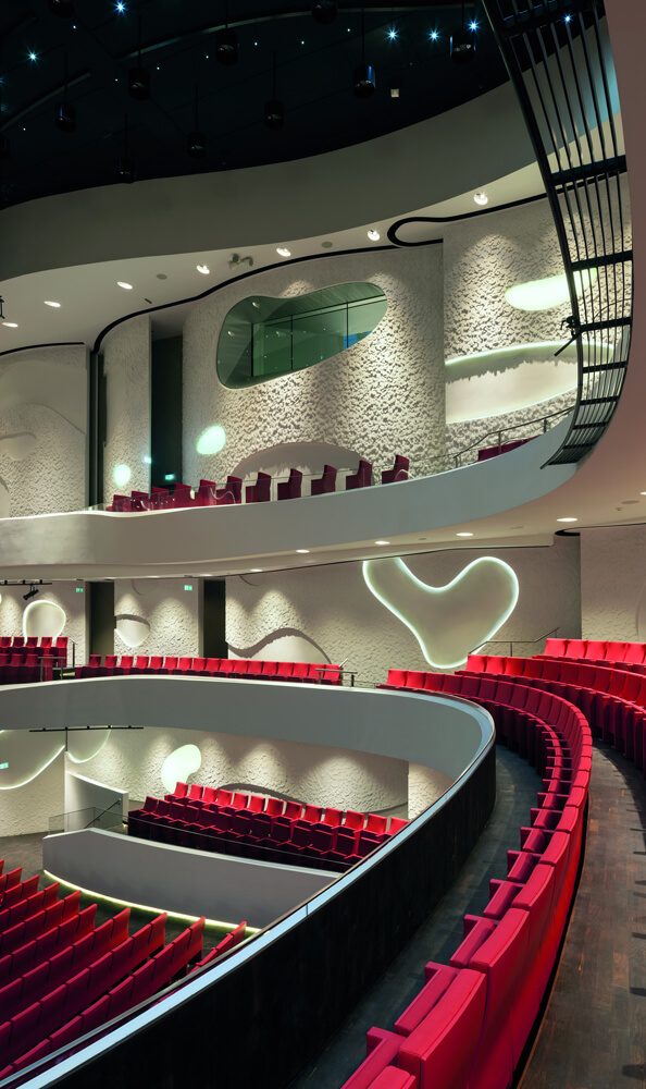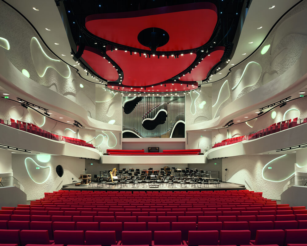 The flowing shapes and curves of the auditorium inside stand in contrast to the strict, cubic outer shape. The seats in the orchestra and curved balconies are arranged in such a way that offers the best possible acoustics and views of the stage. The highly complex acoustic concept was developed in collaboration with Tateo Nakajima at Arup. The design of the amorphous plaster structures on the walls and the height-adjustable ceiling suspensions, based on the exact calculations of the specialist in acoustics, ensures for the optimal listening experience. The concert hall will be one of the quietest spaces for symphonic music in Europe, with a noise-level reduction of NR10 (GK10). Thanks to its architectural and acoustic quality, the concert hall is already well-booked: there will be concerts featuring the Royal Philharmonic Orchestra with violin soloist Arabella Steinbacher and the Danish National Radio Orchestra with soprano Mojca Erdmann in April.