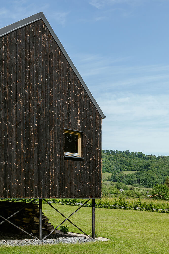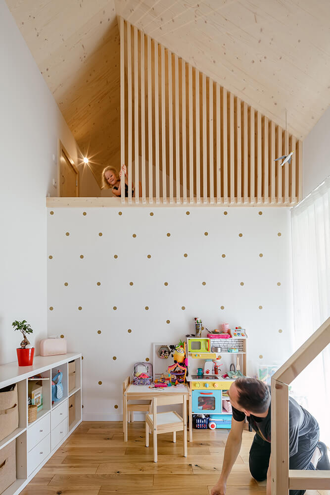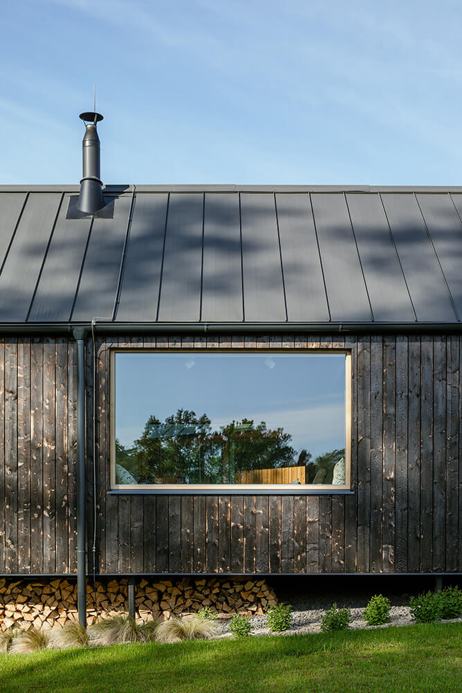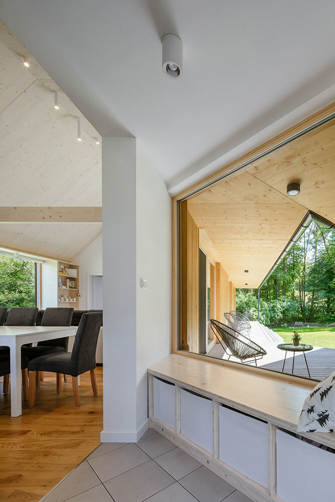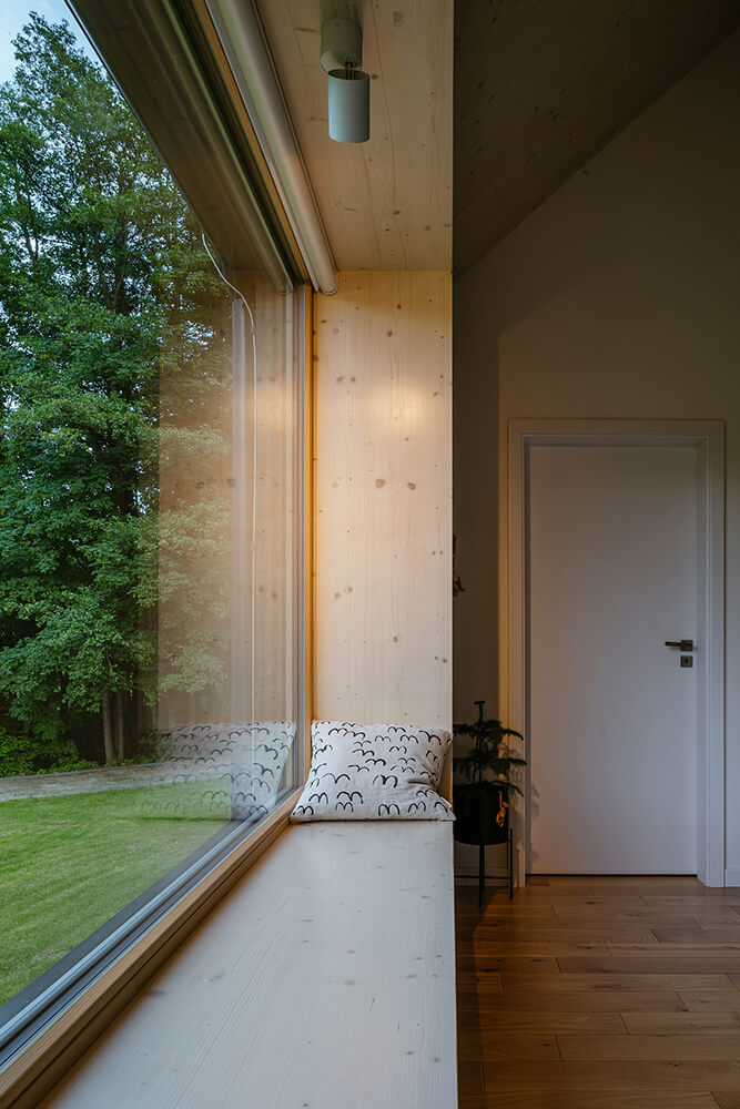 Entering the family wing from the vestibule, we reach a double-height, open-plan living area with dining and cooking. Providing enough views inside and outside the house was emphasised here and everywhere around the building. From the cooking area, a horizontal strip window overlooks the entryway, while a wide window seat in the living area offers views of the landscape beyond. A corridor connects the living area with the private zone consisting of the children’s bedroom, the main bathroom and the main bedroom. The open-plan living area and the bedrooms all have direct access to the deck.