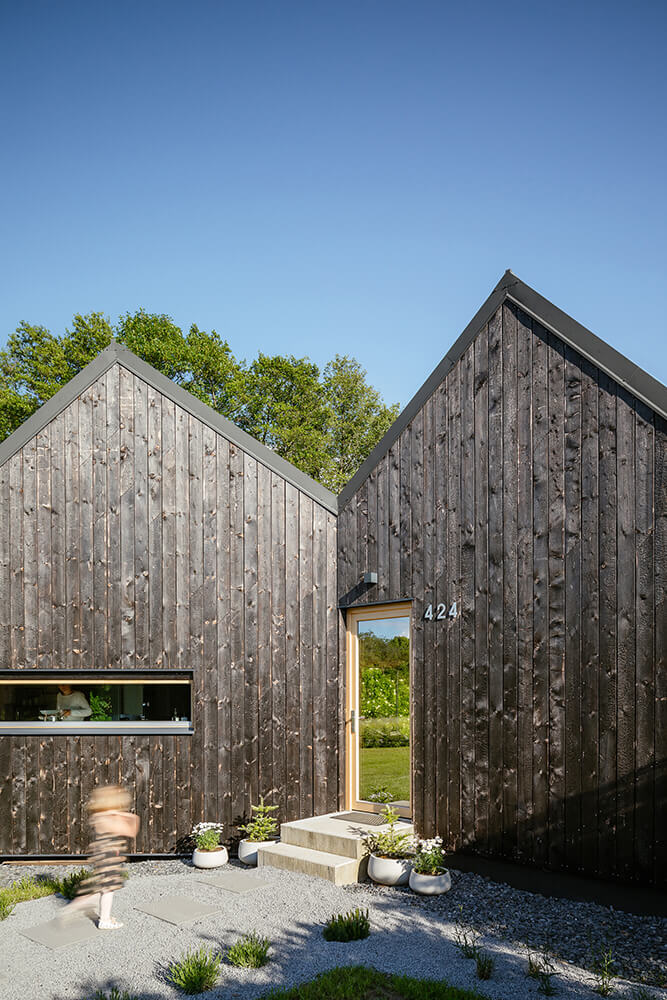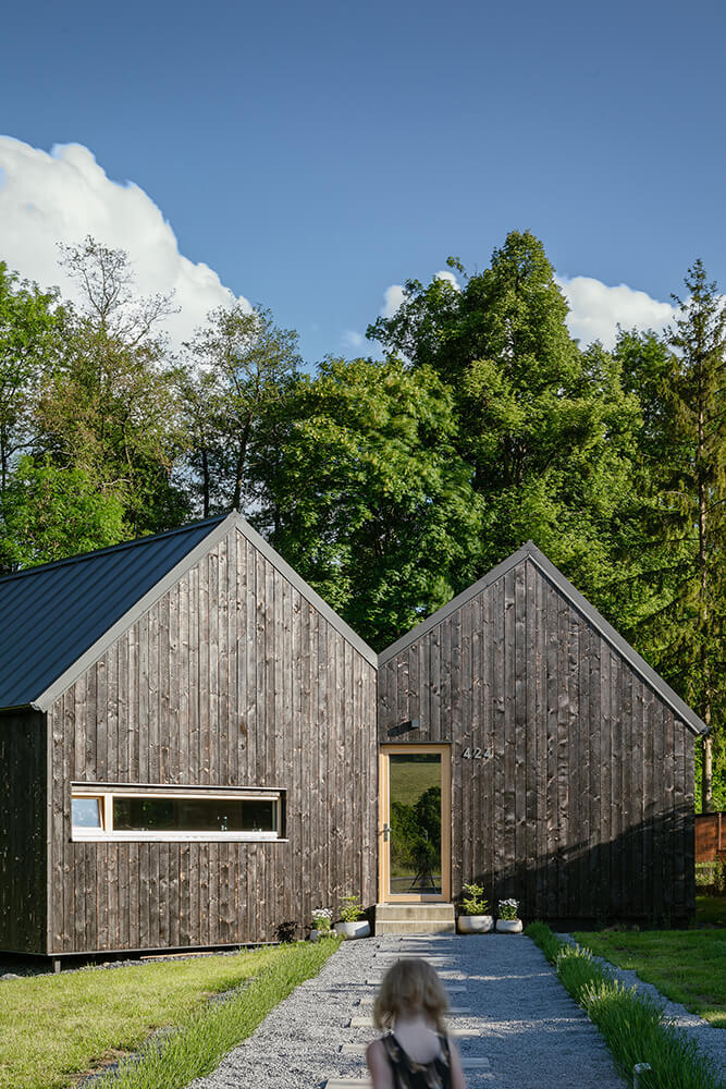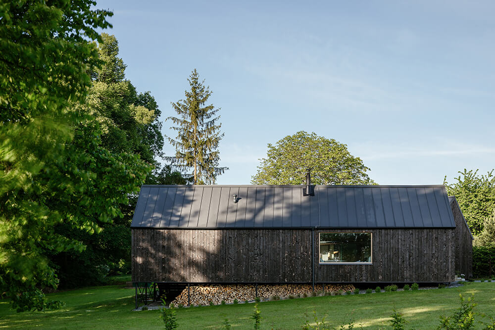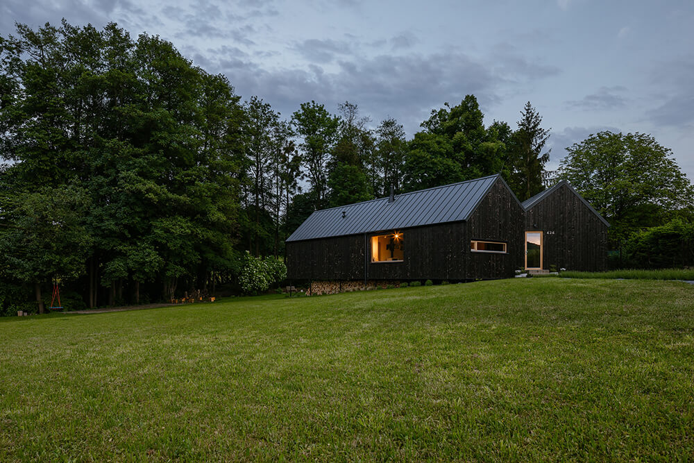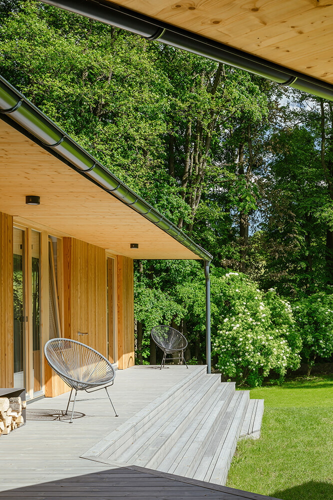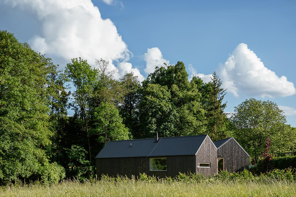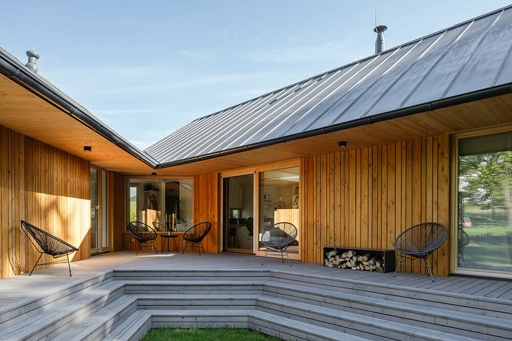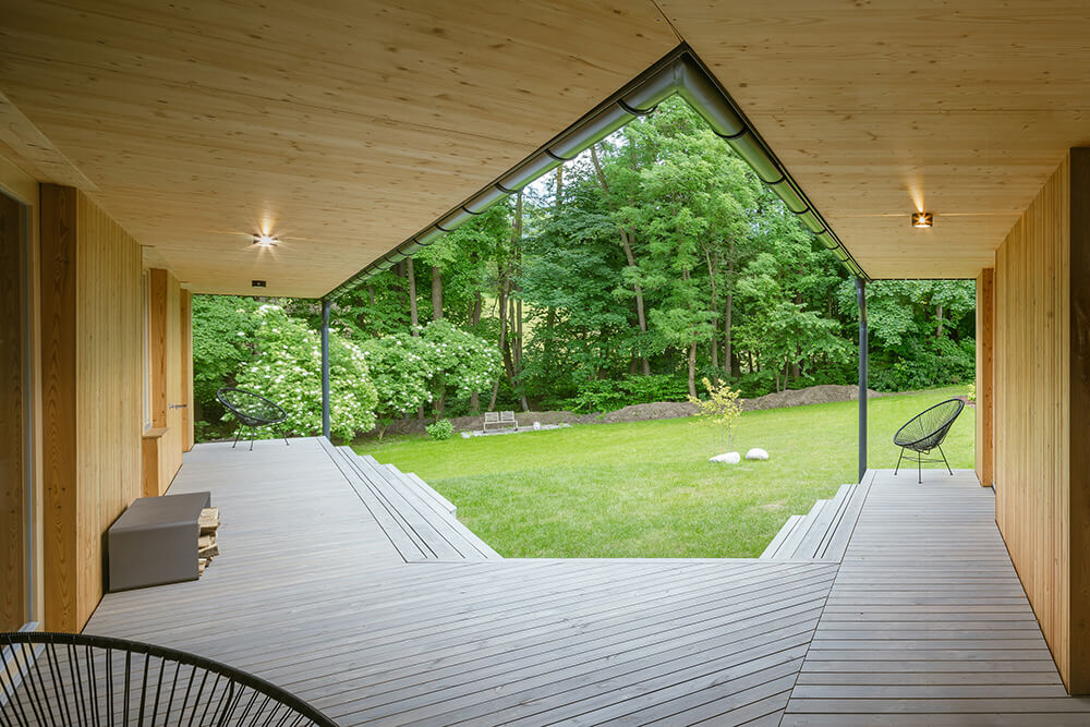 Two elongated volumes with pitched roofs are joined together at an angle and placed on the edge of the buildable area, defined by the setbacks. At first glance, this shape can appear to be reminiscent of the Beskydy region’s typical small single-story home with a pitched roof. The solution with two wings works well to separate the family home and the future in-law suite. A south-facing private courtyard is formed inside the angle, protected from the north and overlooking a nearby forest. Shaded by the roof overhang, a wide deck stretching all the way along the house connects it with the courtyard, offering endless possibilities to sit, relax and listen to the sounds of running water, rustling leaves, or distant hum of village life. Mature trees growing around the stream provide shade from the hot summer sun, but their bare branches let in enough sunlight to reach the house in winter.