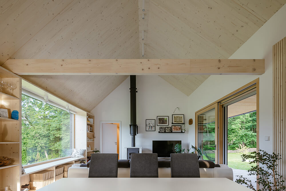 There are almost no neighboring buildings around this greenfield site that would define structure or form. Two pitched-roofed catalogue houses are standing close by, the rest of the village is a mix of detached single-family homes from various periods. Answering the question: “What should the new house look like?” was quite difficult in this case. After considering the budget limitations, program requirements, and the preferred choice of a wood structure building, our final decision was to adopt a rational approach with repeating structural elements.