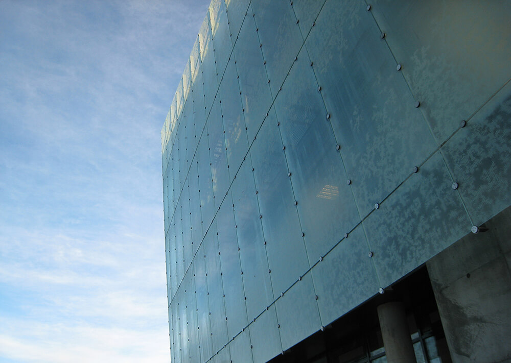 Material palettes are simple and clear. A fritted glass screen envelopes the upper floors, providing a weather shield and supporting the building’s natural ventilation. The glass is fritted with a pattern specially designed for the building; a pattern derived from the familiar formation of ice crystals, which simultaneously diffuses the strict geometry of windows beyond the screen and provides soft shading from low sun angles native to northern latitudes.