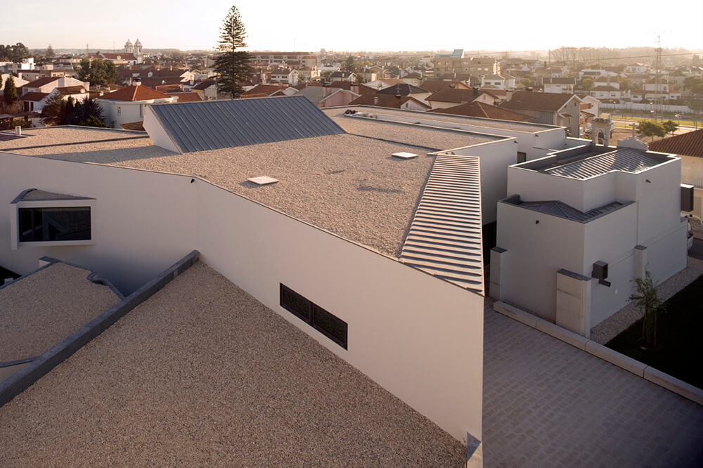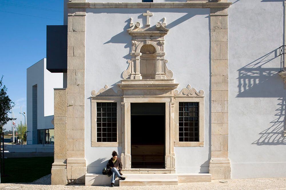 Ílhavo City Library is located in the remains of the Manor Visconde de Almeida, a noble house from the 17th-18th century, later transformed and demolished. From the original building only the main façade, oriented southeast, and the chapel, both in ruins, were left. There was no trace from the carriage porch which completed the building on the southwestern end. However, all elements remaining from the old construction were examples of qualified architecture, in their proportion and elegance of the masonry.