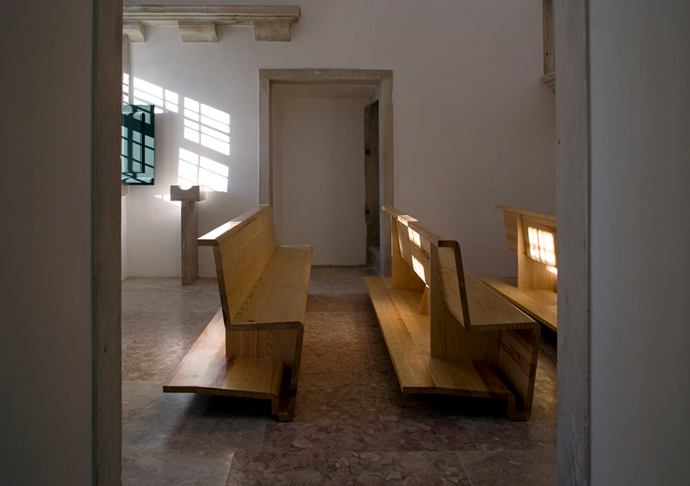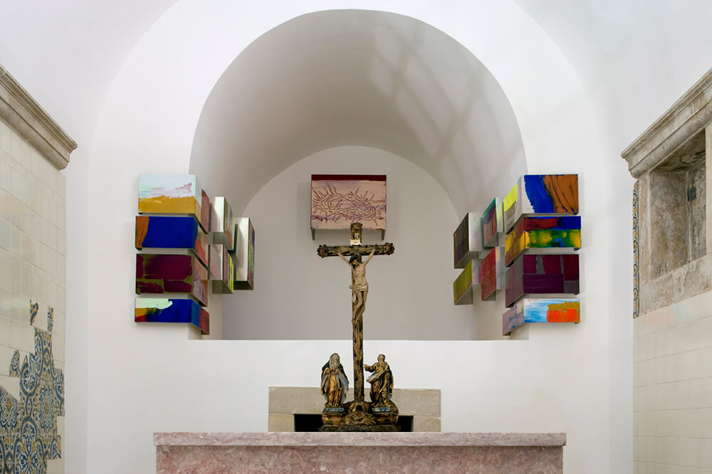 The chapel, deprived of its most impotant decorative elements, like tiles, woodwork, tomb stones and furniture was restored in essence preserving all possible evidence of its lost past. The furniture and the new altar panels by Pedro Calapez, were designed in an unequivocally contemporary style, which rediscovers the typology of original polichromic work.