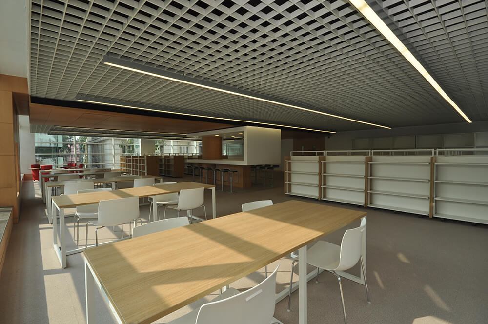 – The reception has been designed as a triple height space naturally lit by a huge skylight above. The corridors and spill out spaces culminate around here at the upper floor levels. Care has been taken to ensure that the library is also well lit during the day and has been designed such that it is surrounded by glass on three sides, shaded by the existing trees on site.