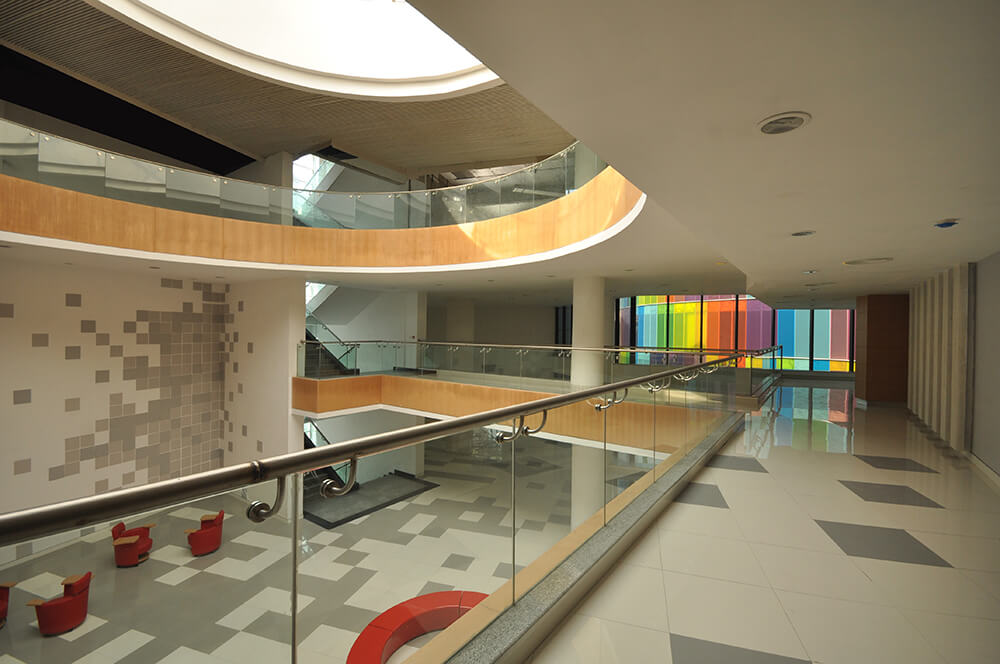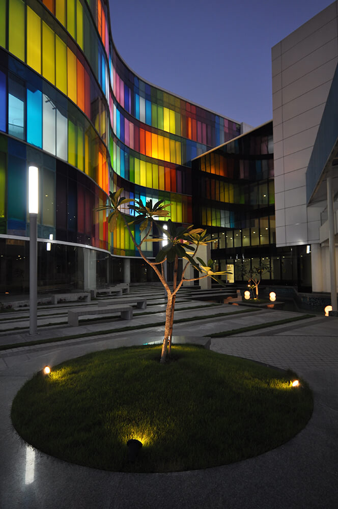 – Circulation spaces and spill out zones have been created along the curved glass façade, allowing them to be naturally lit in the day and giving them a more interesting and dynamic feel. Emphasis has been given to interaction points not just for students but also for the faculty encouraging exchange of knowledge and ideas at all levels.