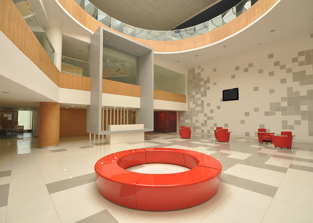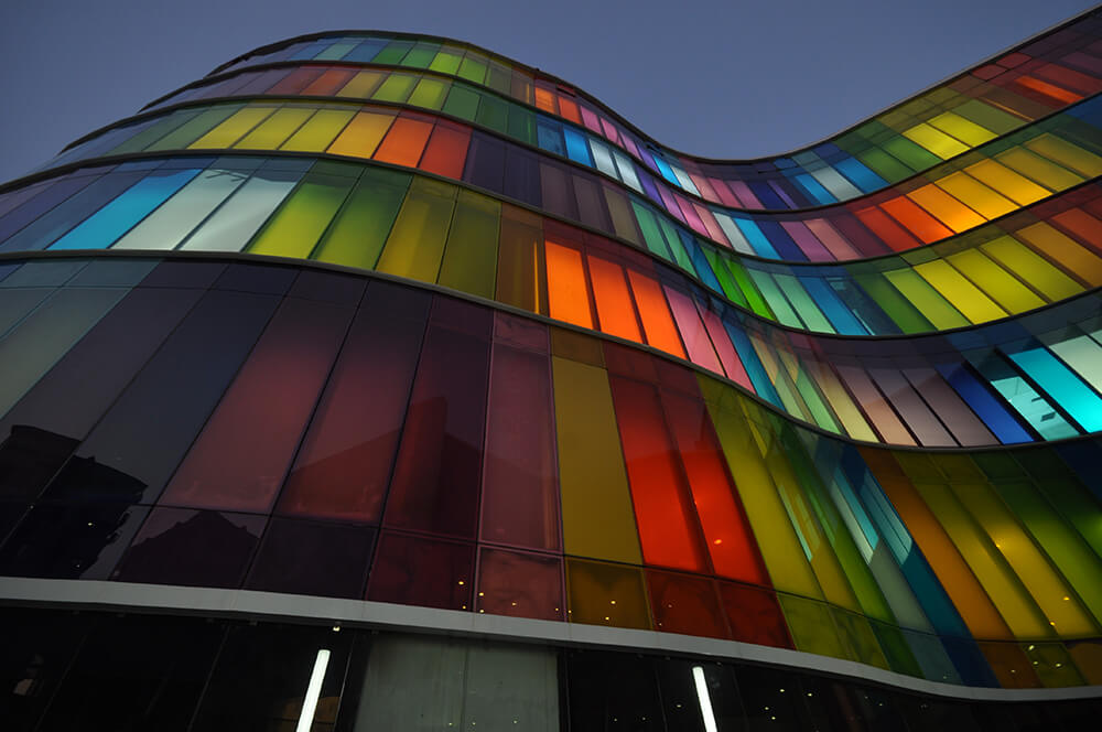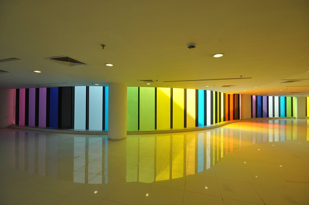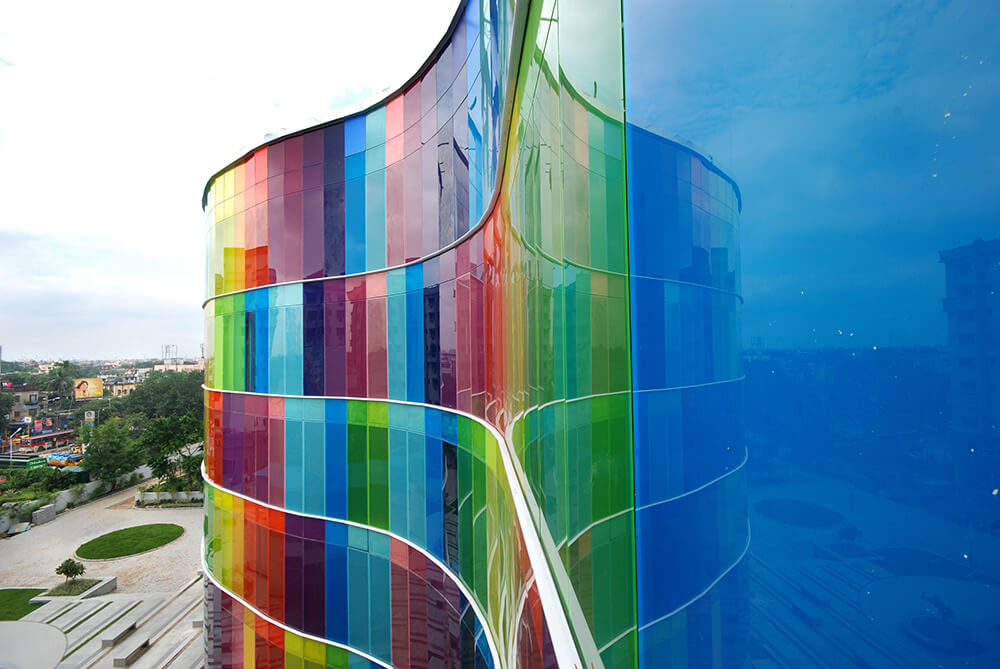 – The chromatic glass façade comprises of 2 layers of 5mm clear glass each with an intermediate PVB layer 1.2mm thick which acts as an insulator, reducing the heat buildup inside. The façade becomes more dynamic by night when the inside lights are switched on and has a mesmerizing effect on the plaza below.
