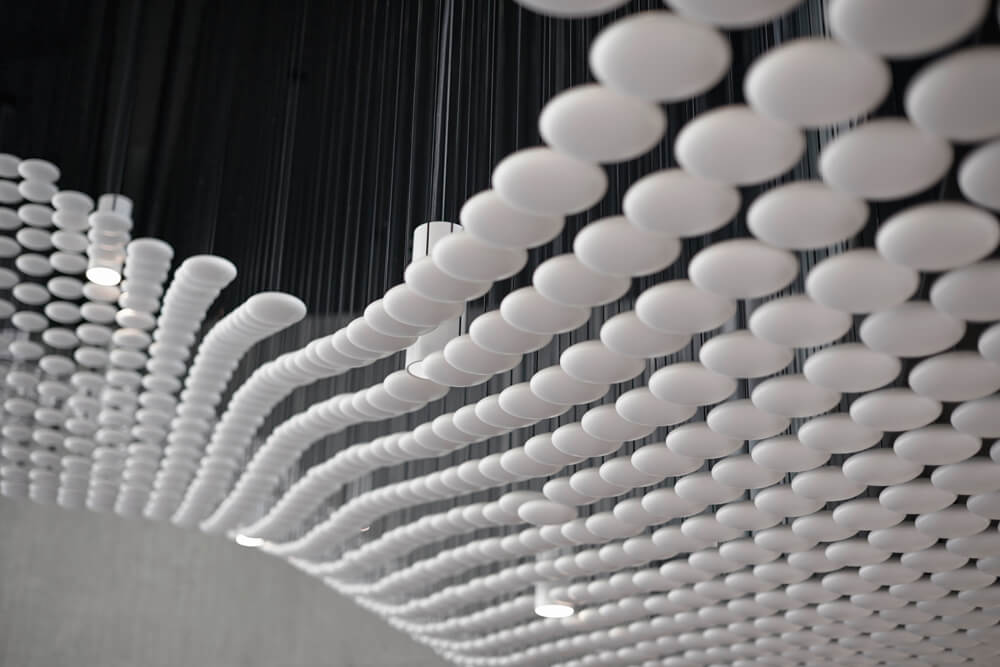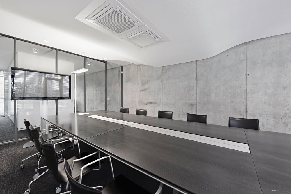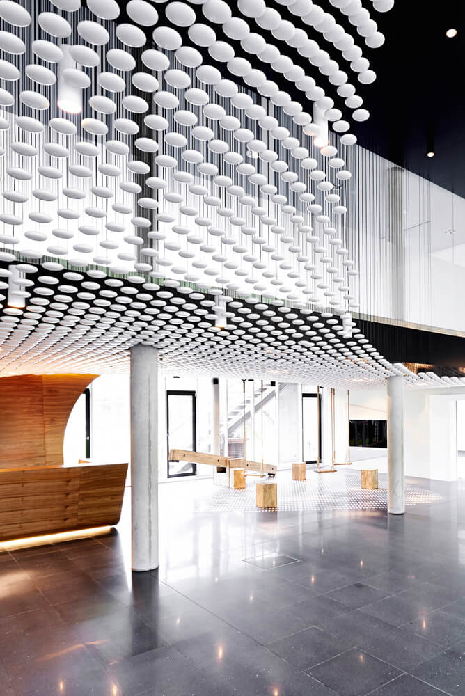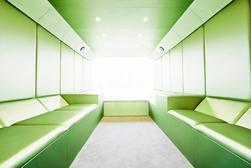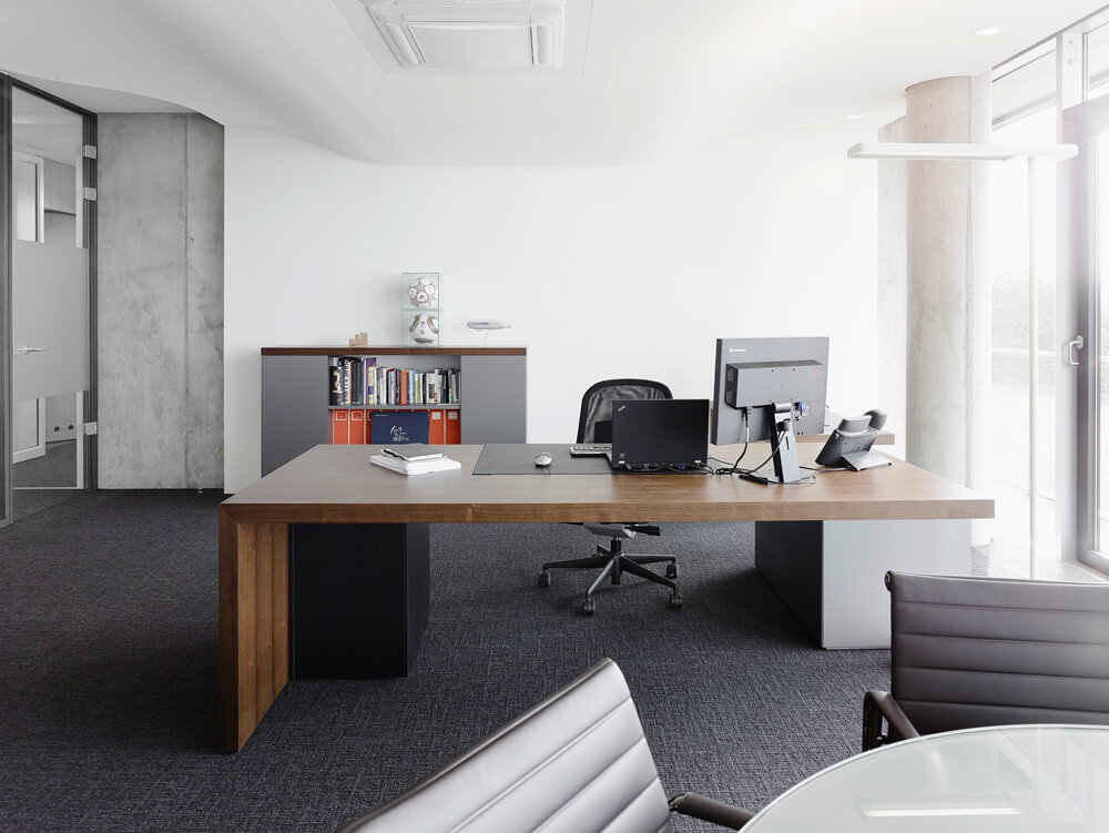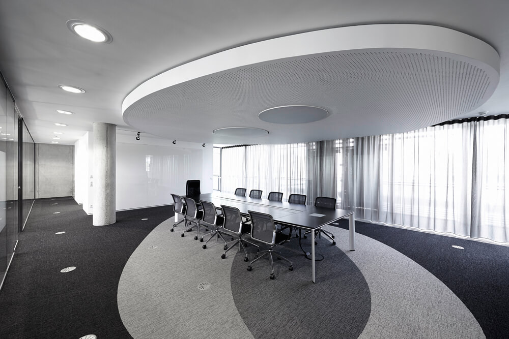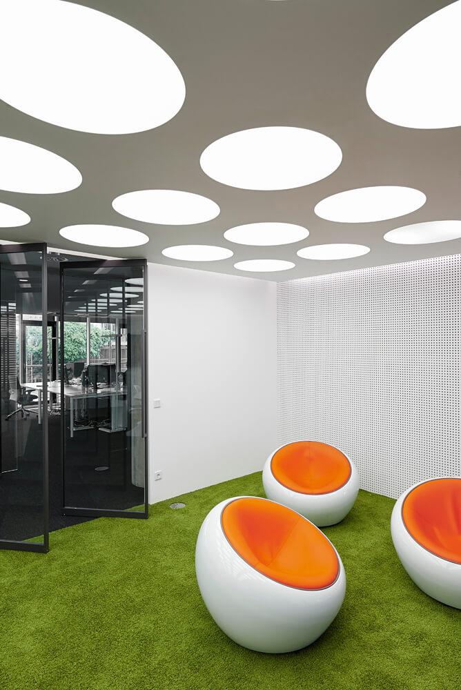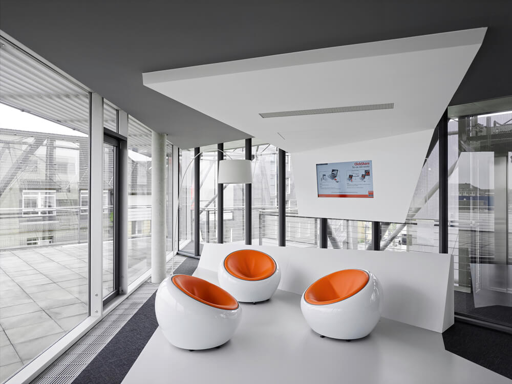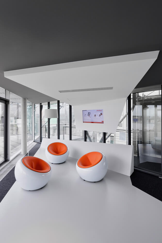 Dynamism and movement are key features of the design, which assimilates employees and visitors the second they enter the spacious reception hall. These design elements guide you through the open work zones and the specially created employee library right up to the in-house gym on the fifth floor, which offers an amazing view over Frankfurt. Polygonal spatial elements and a wide range of materials represent the high design standards of the agency itself. Open and transparent work areas, paired with semi-public and completely discreet conference zones promote a creative and communicative working atmosphere.