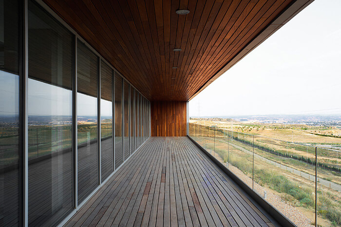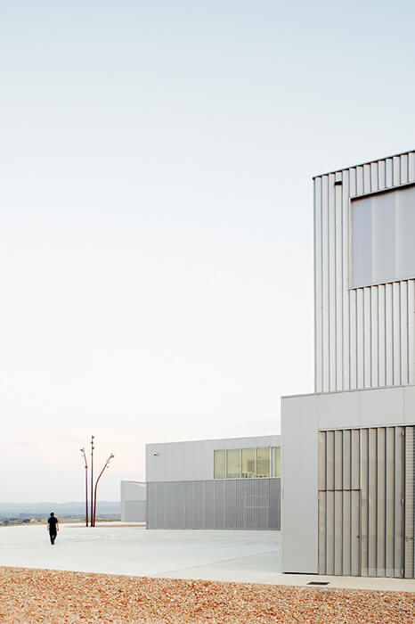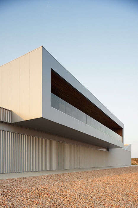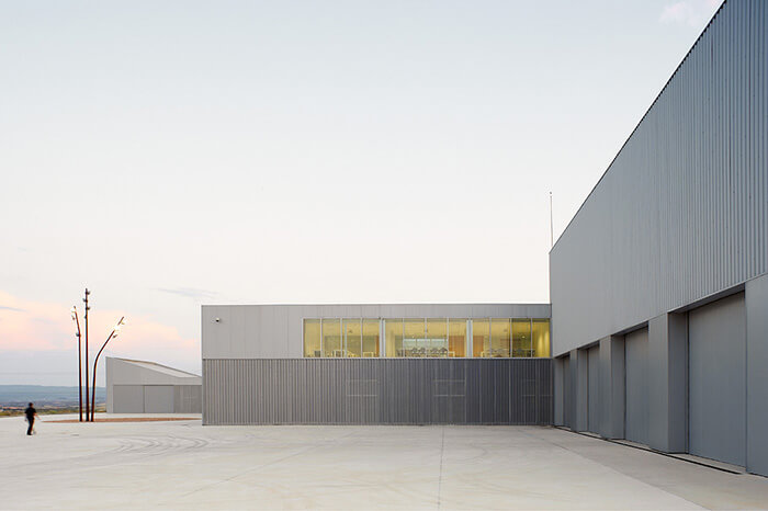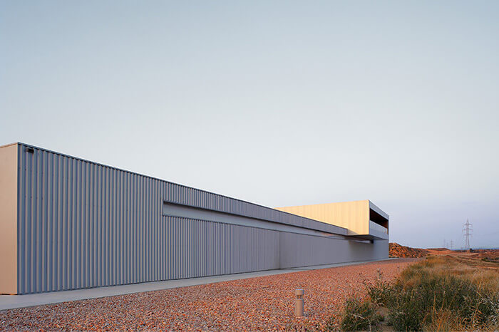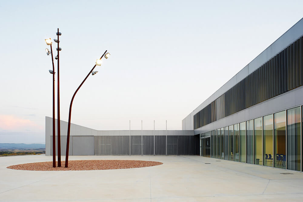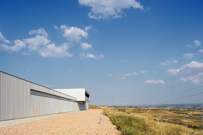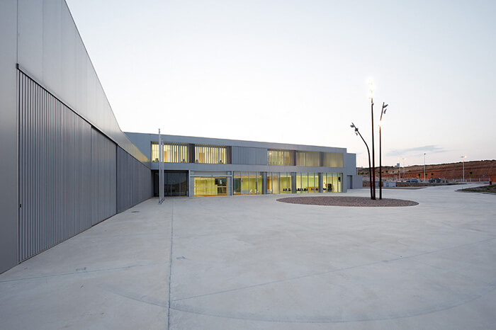 The plot, on which it is located, is rectangular, 130 meters wide by an average of 116 meter long. Its total area is 13,351sqm. It’s located on the eastern edge of the technological park of the Alcañiz’s Motor City. It occupies a dominant position on a promontory overlooking La Estanca and the new racetrack Motorland Aragón. The building responds to this situation with a projection on the first floor which houses the administrative and management areas of the centre.