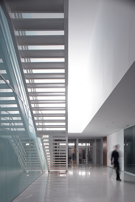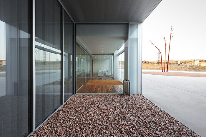 The building required open plan spaces, meeting rooms, offices for educational use and a management centre, that are connected with the main areas for research of vehicles. This program is complemented by a lecture hall, a cafeteria and dining room, which are located on ground floor, and an outdoor parking space and a route for heavy vehicles, which allow them the access to the different areas of research.