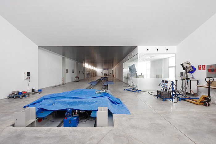 The premises 2, 3 and 4, lower than the first one, are intended for laboratories specializing in engine research, materials and impact in pedestrian. They also have a vehicles acceleration lane.