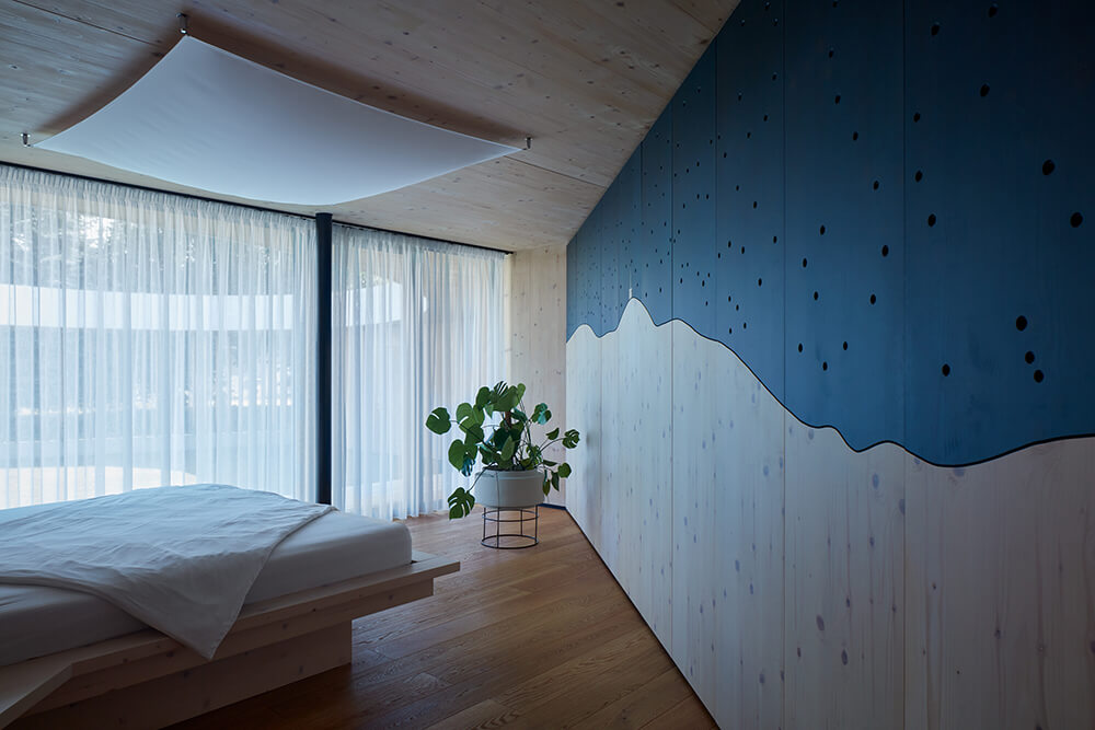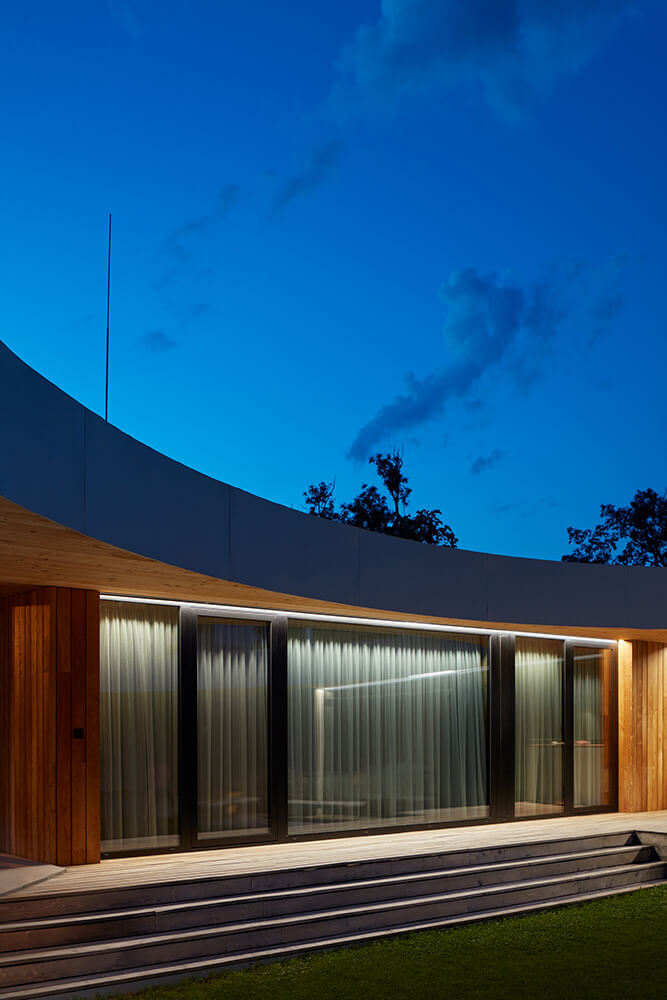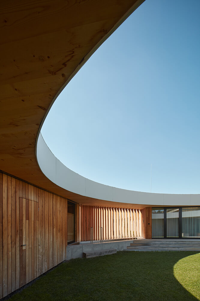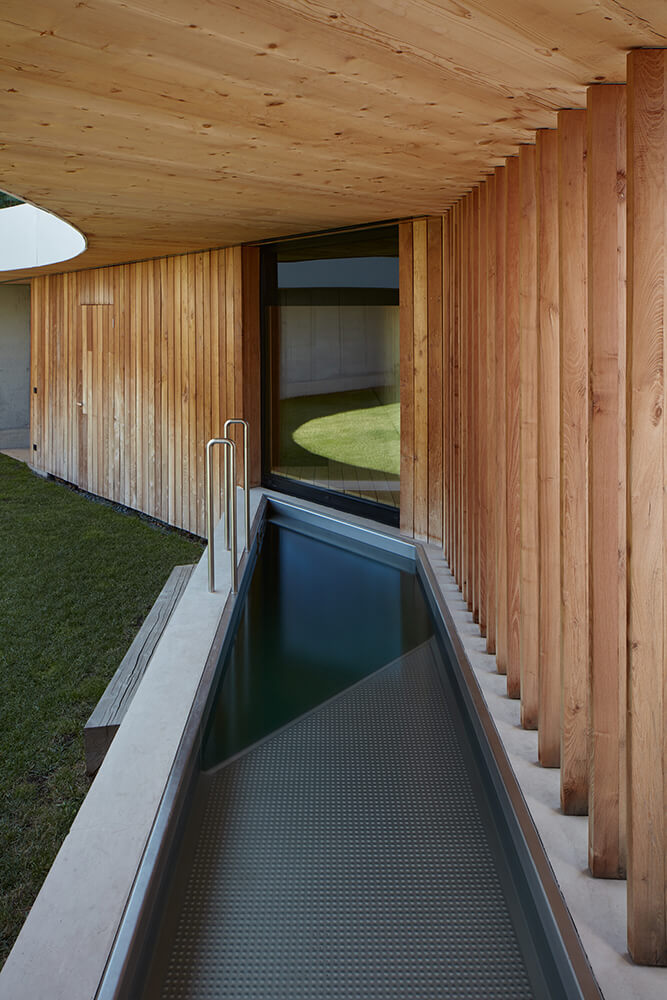 The two-storey residence is located on a gentle sloped terrain, which is fully reflected in the concept. The building is composed of an inner residential landscape facing inwards, into an inverted living experience, in parallel with providing openings into the outside world. The villa is horizontally divided into three different platforms. The entrance platform at the street level is made of concrete and contains the utility rooms. The main living platform with the social area is elevated by a little less than a storey above the street level. The external atrium is elevated by another half metre. The social and resting areas are constructed of timber, and are orthogonal to each other. Both areas are connected to a grassy atrium, the inner core of the whole house. A sauna with a small plunge pool closes the atrium separating it from the street.