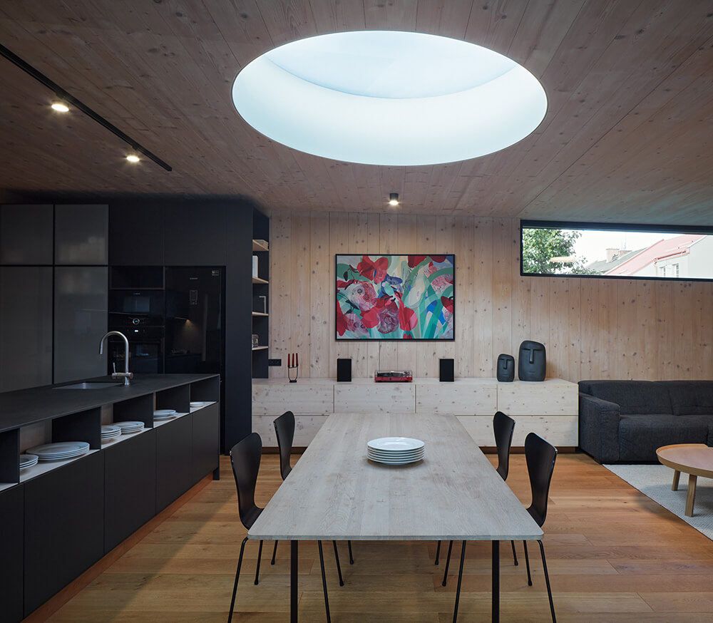 “I wanted to try and create an inner disposition in which people can move naturally, where they can swim like a fish in the water. The kind of relaxed living where you subconsciously anticipate where everything is. The natural flow of the daylight is most important. As light flows through large windows as well as through circular openings in the roof. When I first visited the completed project, my eleven-year-old daughter unexpectedly stayed there for the next three days, because she loved the space so much.“ (Marek Štěpán – Naturalness)