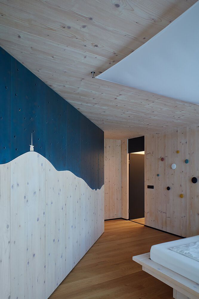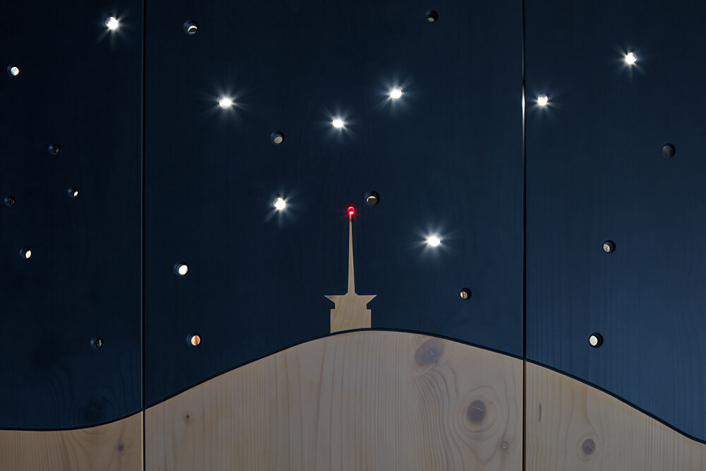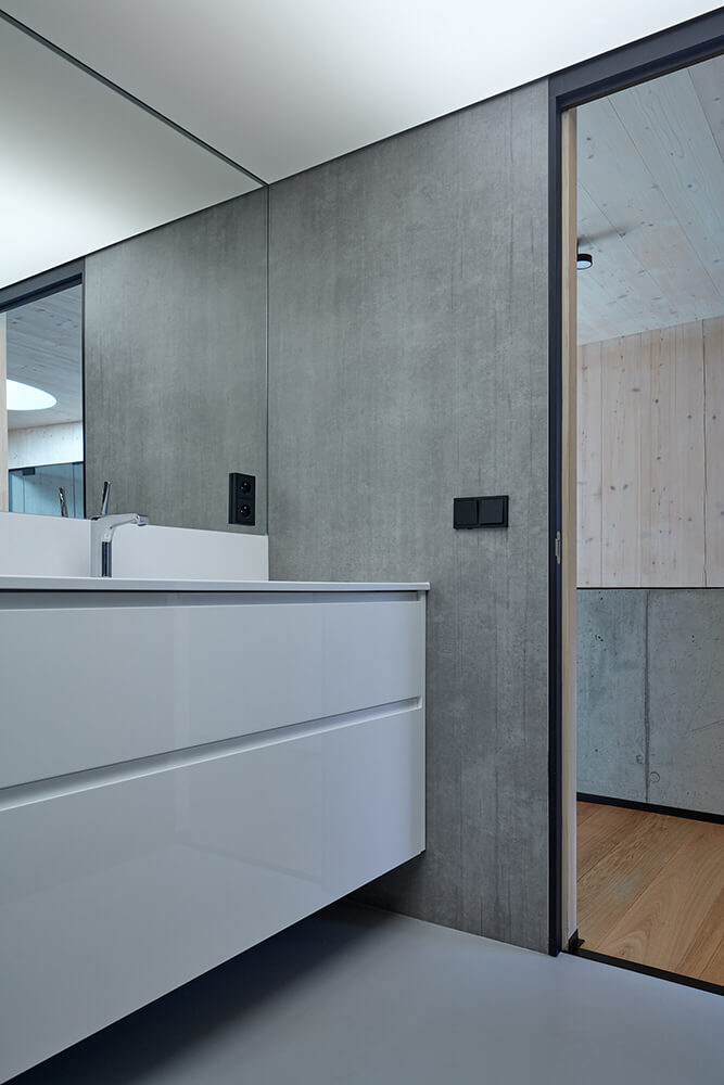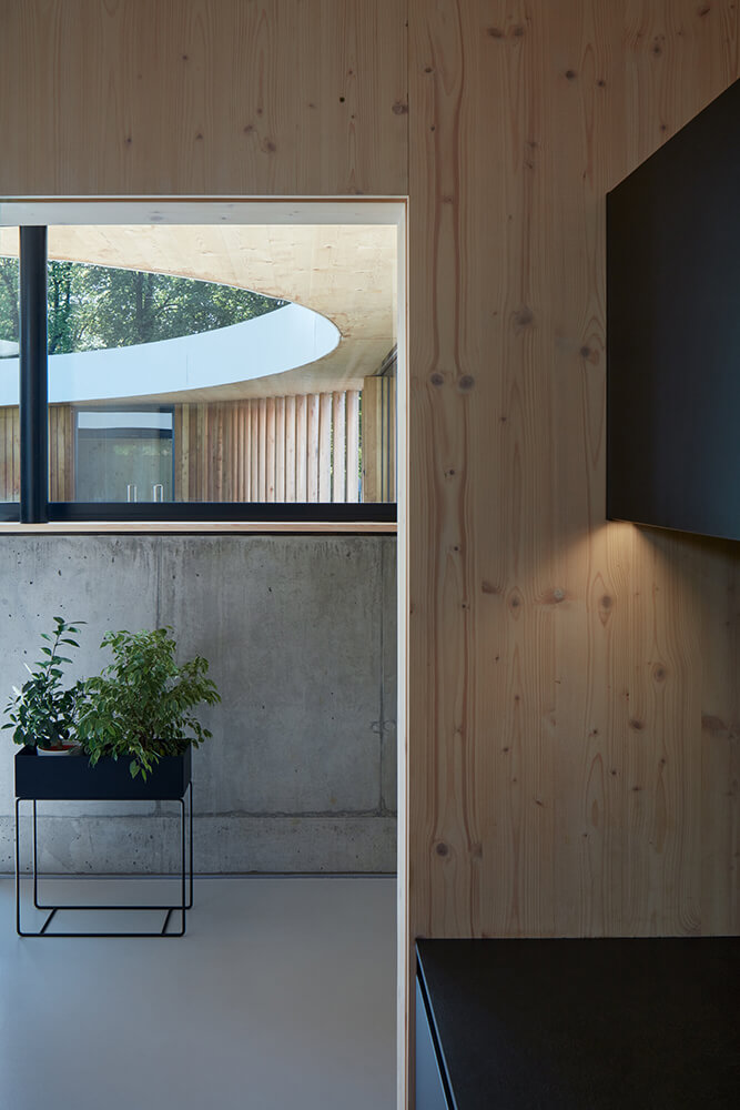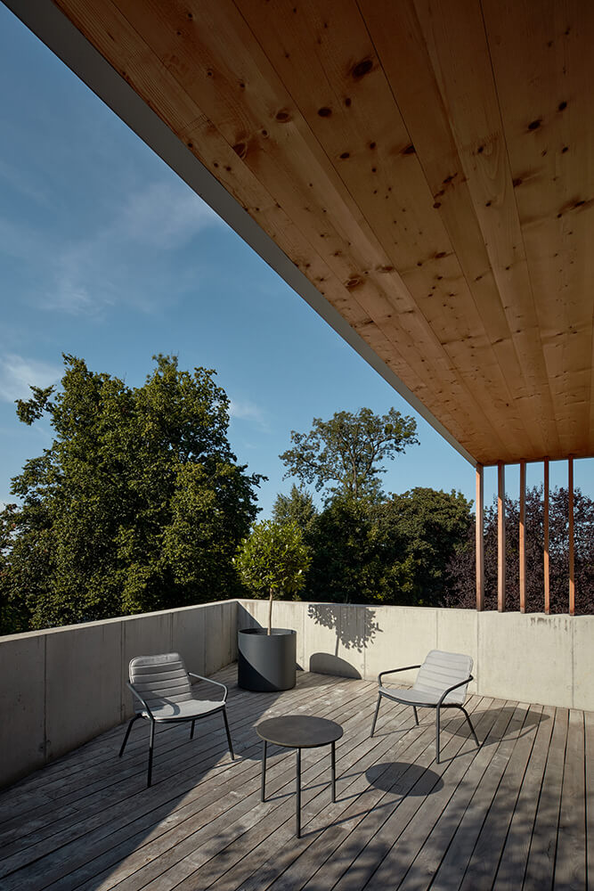 Describing it in simple terms – the bottom is made of concrete; the top from timber. The basement is made from faced white waterproof reinforced concrete. The storeys above the ground are constructed of large panels of Cross Laminated Timber. The outside walls are clad with locust timber cladding. The interior floors are finished unpolished concrete or oak, and the outside terrace is made of locust boards and a grassed area. The black aluminium glazing system is triple glazed.