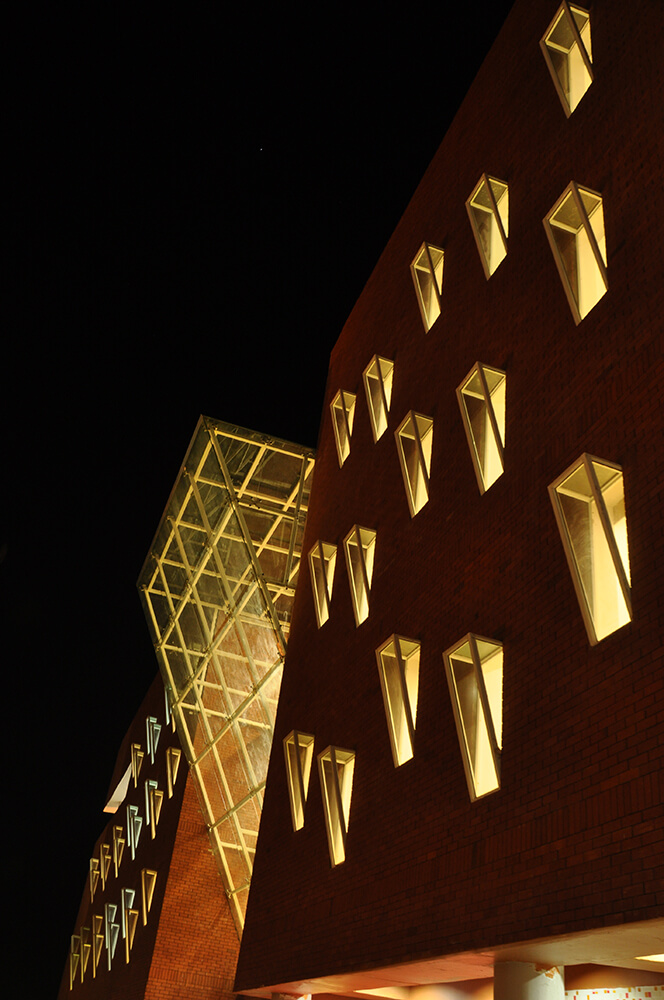 The atrium of the library block has been pushed outside with an inclined glass box to invite natural light, hence reducing the cost for artificial lighting. Daylight analysis reveals that the design of interior spaces allows for optimum daylight penetration with the aid of the huge glass wall in the library atrium. Moreover low VOC paints have been extensively used keeping in mind the indoor air quality and the public health.