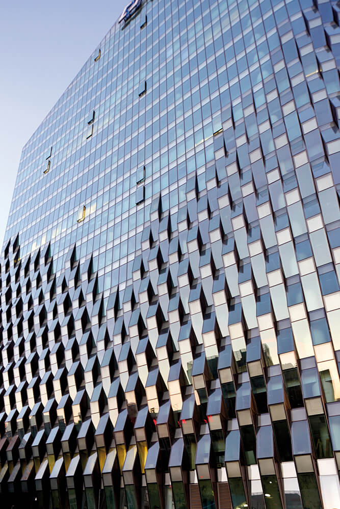 The ‘thickened’ facades perform a number of functions beyond enclosure. Firstly, they baffle the traffic noise of the ring road and offer a level of acoustic protection to the interior. The weave effect on the towers is thus concentrated at the lower levels, fading out with height. Secondly, in the case of the woven glazing, the façade engages with interior space by sculpting new habitable zones at the building’s edge.
