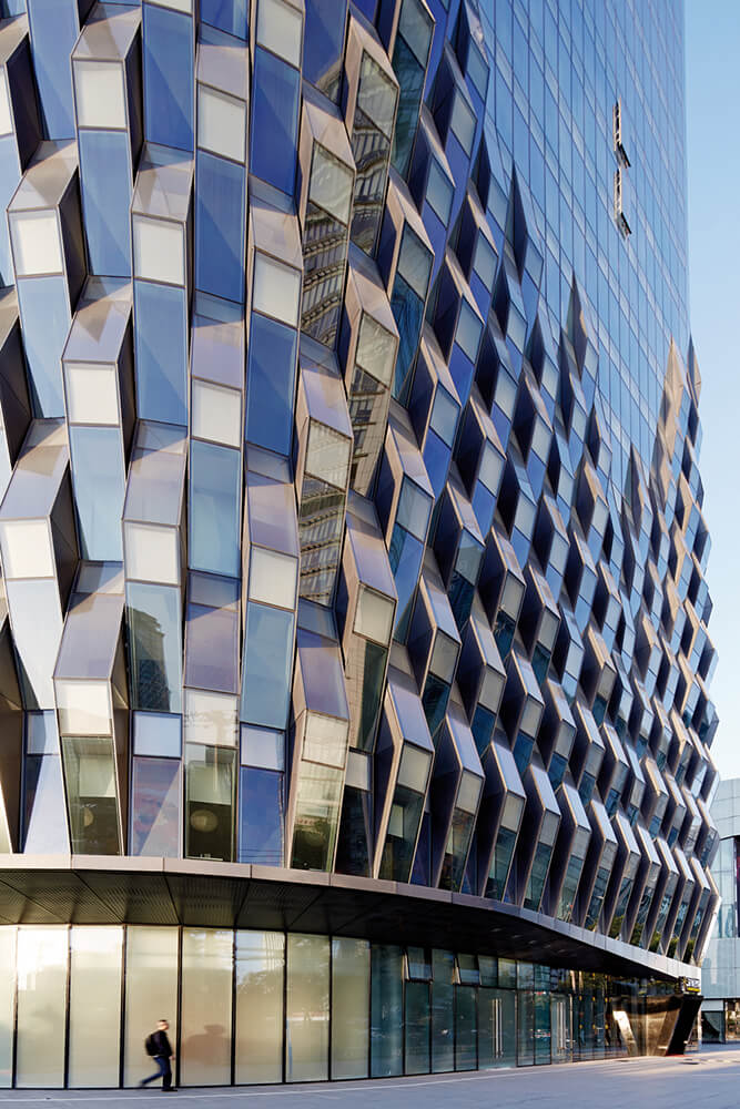 The inspiration for the ‘pleated’ and ‘woven’ façade was drawn from the former presence of the textile market. Says SPARK Director Jan Felix Clostermann, “The pleating and weaving effects emerged from the visualization of the facades as pieces of three-dimensional fabric rather than paper-thin curtain walls.” Pleats of perforated aluminium sheet establish a heavily textured façade for the retail podium, while angular ‘threads’ of glazing adhere to a weaving logic that slowly dissolves as it progresses upward.