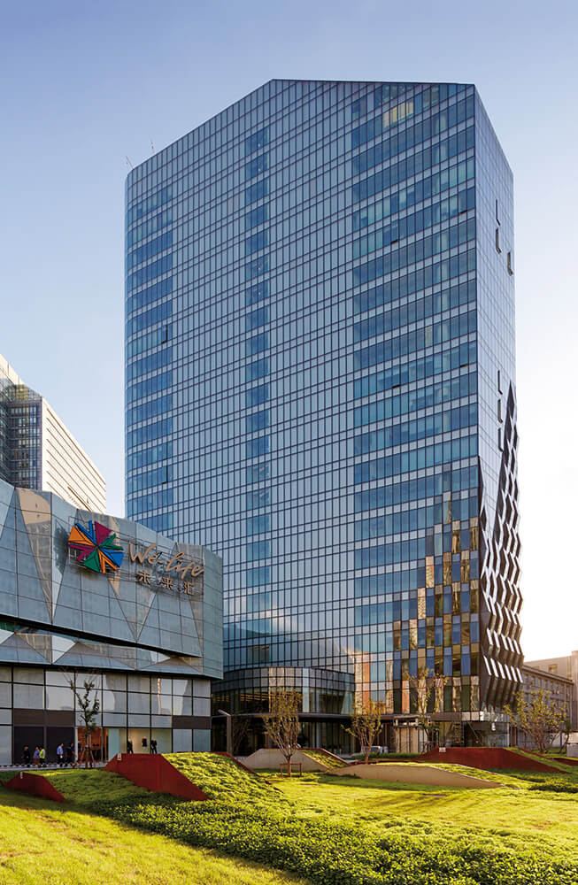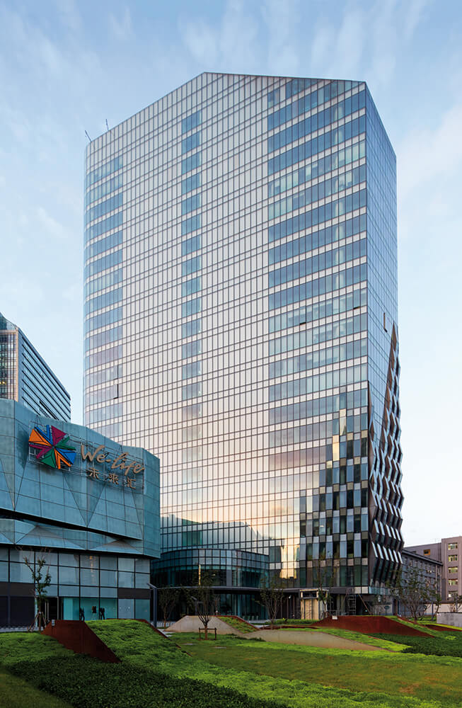 Simultaneously, the woven glazing establishes new opportunities for ventilation. Clostermann explains, “The weave allowed us to add small side openings for natural ventilation. In most of Beijing’s Grade A office developments, windows are very large, heavy, top-hung panels that are difficult to operate and prone to falling. Many building operators do not allow windows to be opened for this reason, yet air conditioning is usually switched off at 6pm and remains off on weekends. This is a problem for those who need to work beyond regular office hours.”