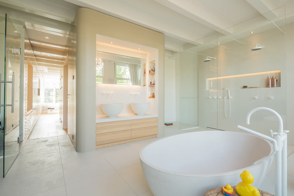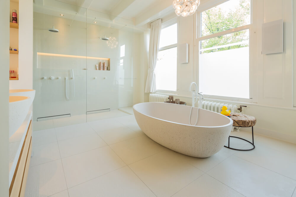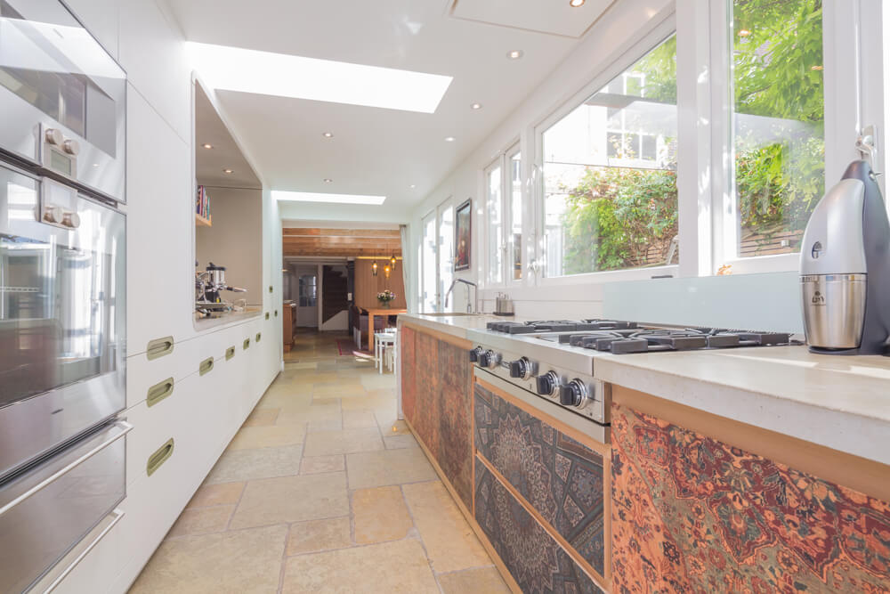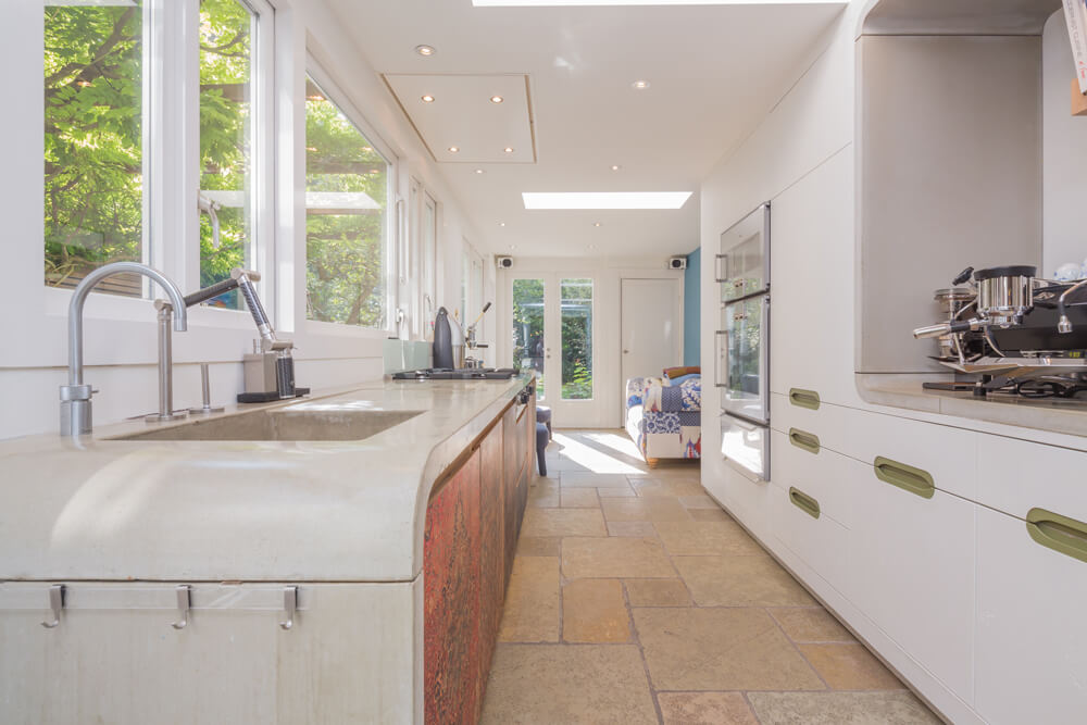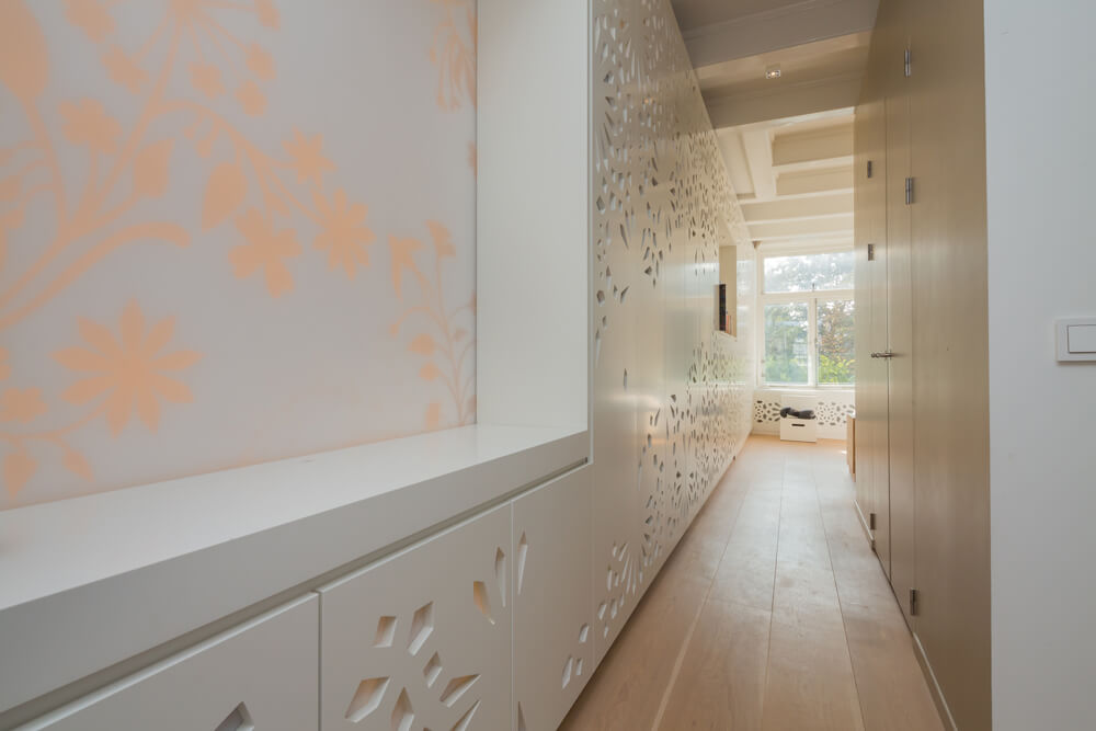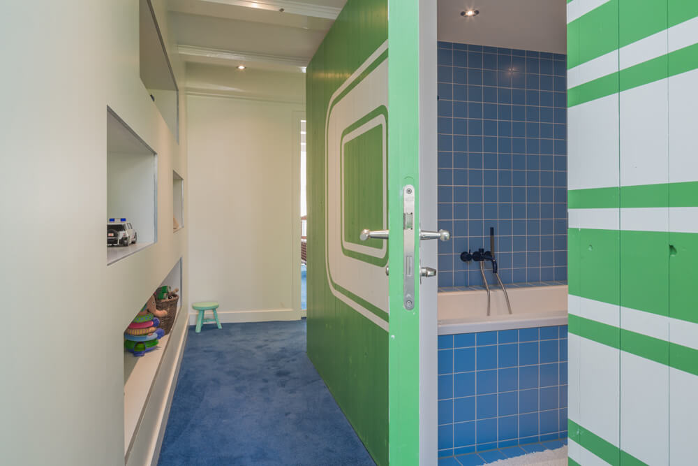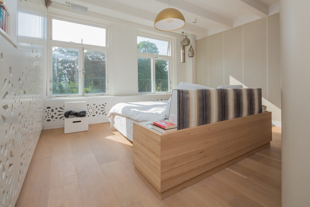 On the ground floor the central element is made of Elmwood and includes the toilet and the new entrance to the basement. The kitchen consists of two parts, with concrete counters with rounded corners and modern cabinets with either white concrete doors or wooden doors with a print of Persian rugs. To get more light in the kitchen a few walkable roof lights were installed in the roof above it. On the first floor are two rooms with antique interiors that were left unchanged. unchanged. The second floor is entirely for the parents with an elongated element in the middle. Around it are custom made furniture such as the bed and a wardrobe along the entire wall that features doors in a laser cut pattern. Next to the modern freestanding bath are antique cast iron radiators that were coated bright white. The third floor is the domain of the children with the bathroom as a central element that they can run all around. A reading bench is incorporated in the element and the years of birth of the children are painted on as sports icons.