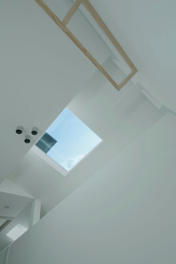 There is a thin steel eave which is fixed to the façade of this house as if it is floating, and a key-shaped slit like a “picture”, crossing over the eave. A red wine-colored door. These are all combined to work like a beautiful pattern designed on a jewel box.