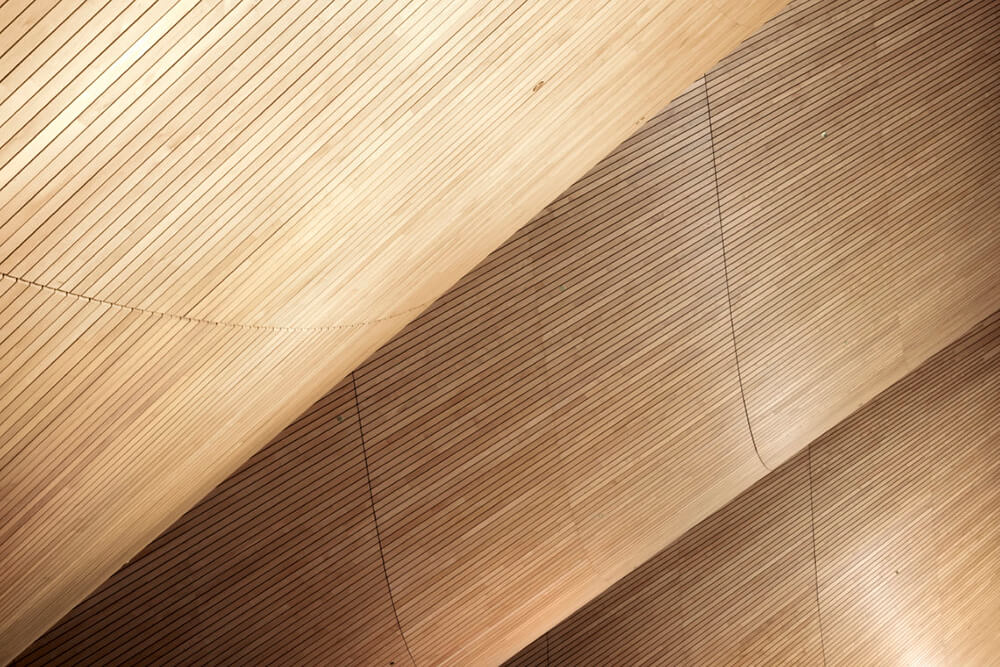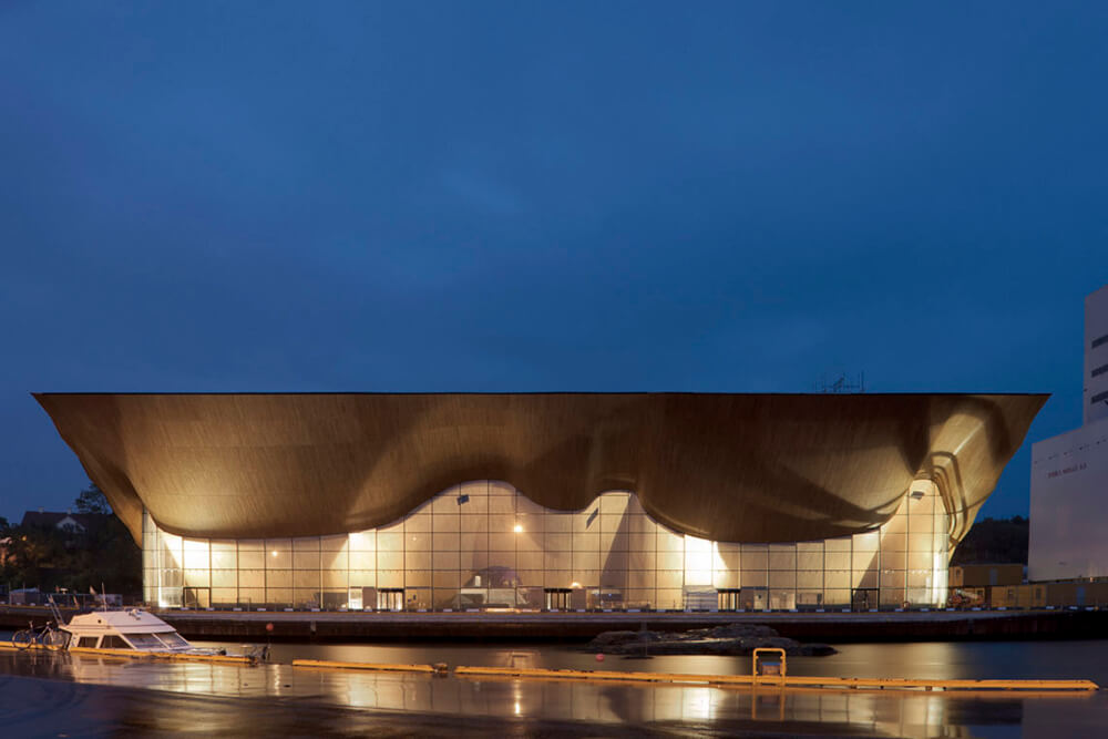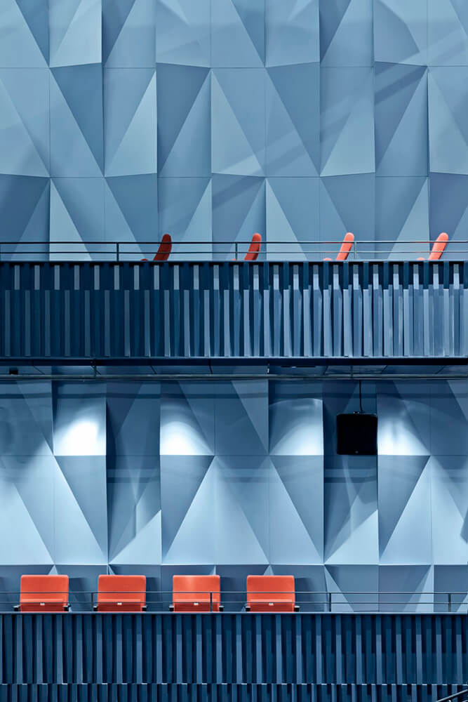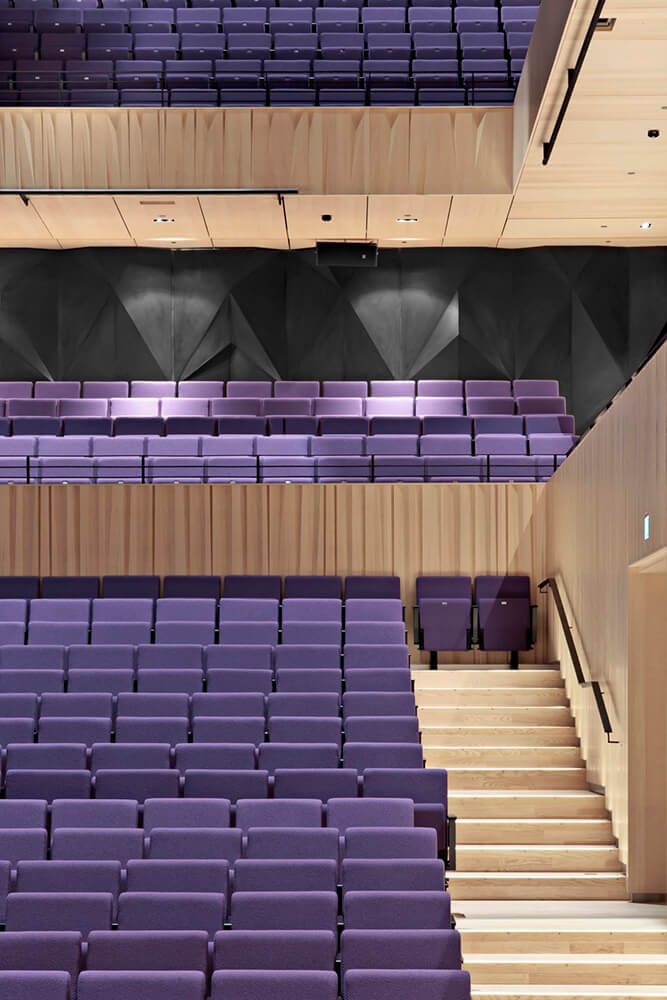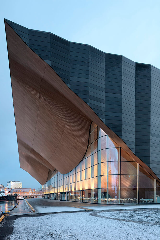 Kilden produces experiences. The way the concert, theater and multi-purpose halls are serviced efficiently and without interference forms the core of its architecture. The monumental abstract form of the wall made of local oak separates reality from fantasy. Passing through, the audience will move from natural landscape to the realm of performing arts. This wall made of wedged CNC milled solid planks is not only a disguised theatrical effect but a concrete tactile artifact, which also improves the acoustics of the foyer. The infinite blackness of the other facades emphasizes the spectacle of the foyer.