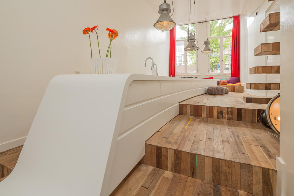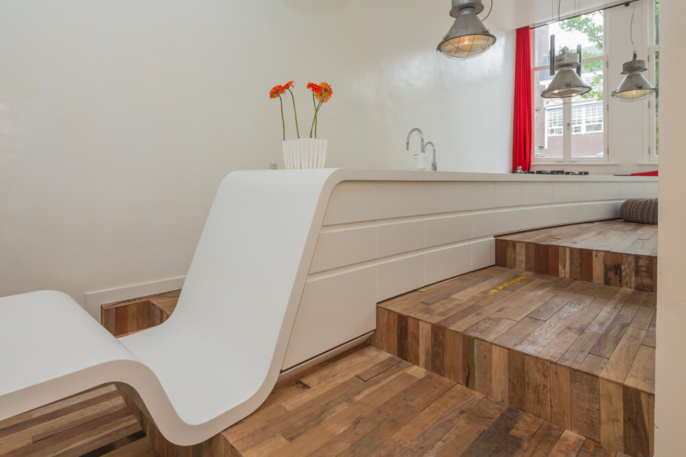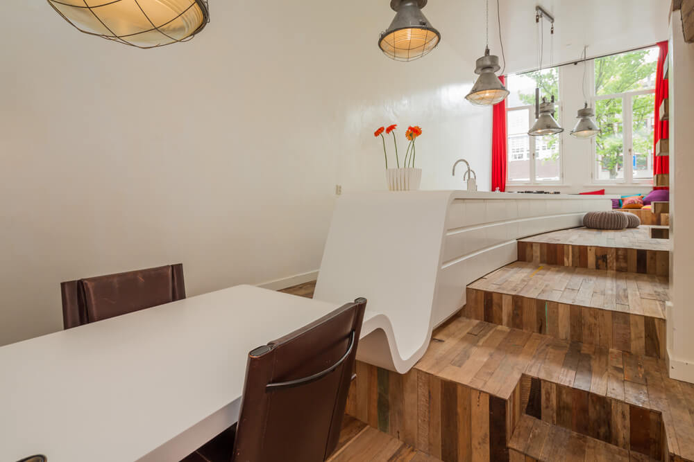 We proposed one new flowing element that integrated kitchen, dining table and a pit lounge with canal view for drinks. It adapts to the space and routing of the apartment and almost glides over the different levels of the floor.