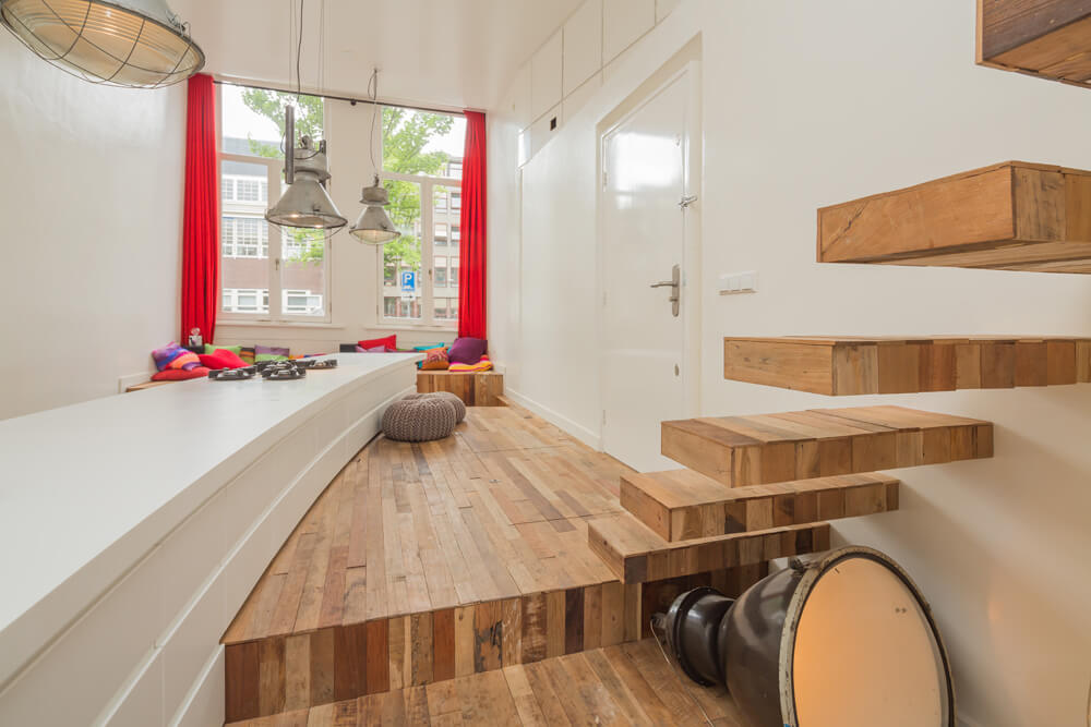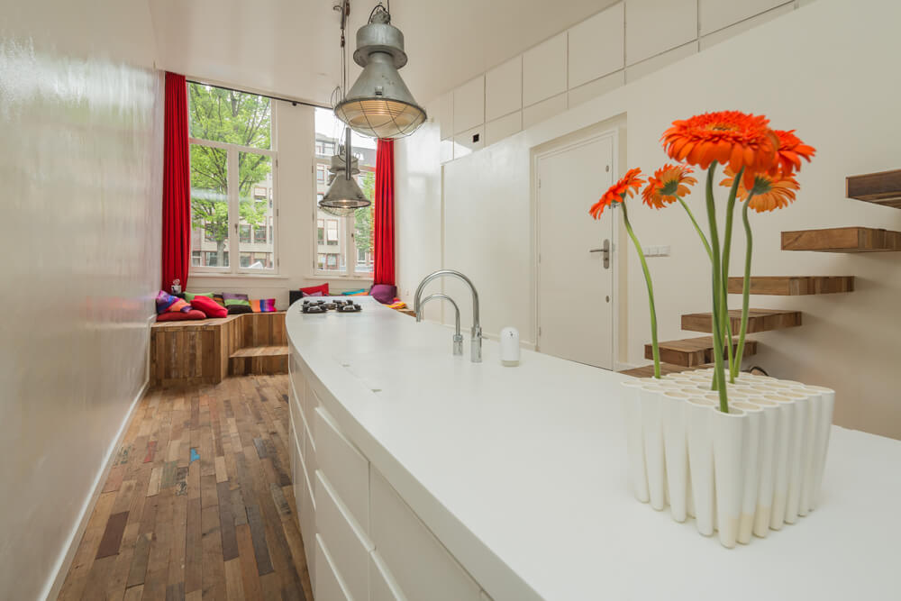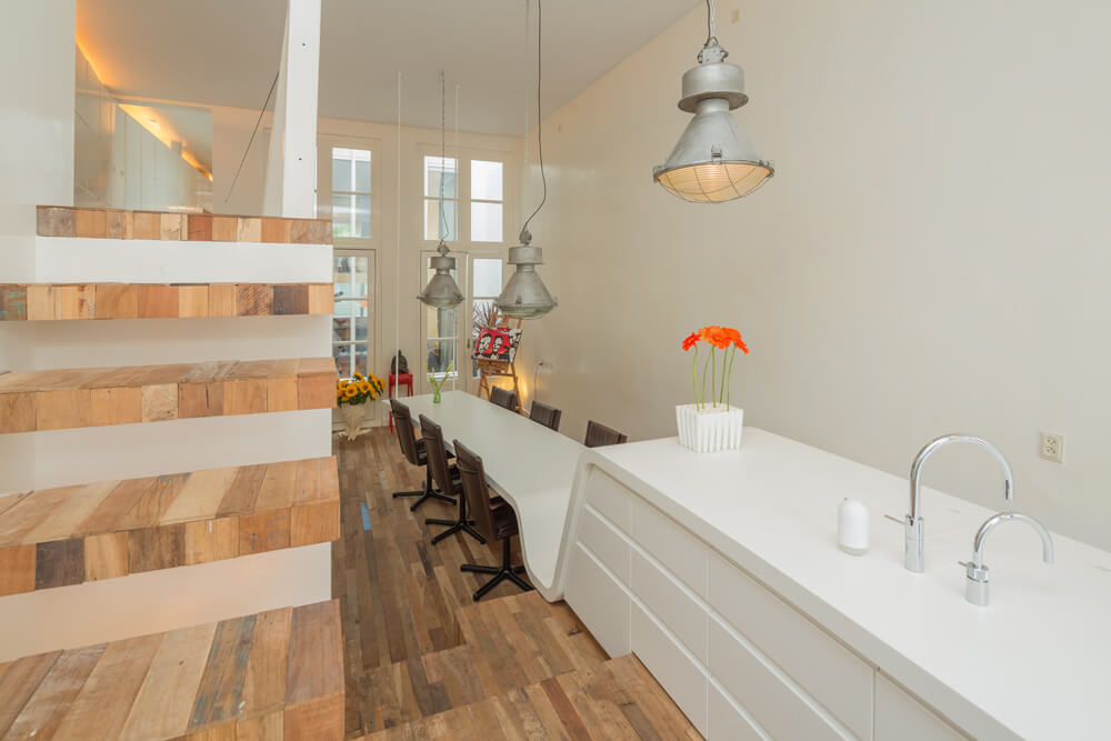 The floor is made of reclaimed wood from houses in Indonesia that gives it a mostly raw and vibrant appearance. In contrast, the kitchen is entirely in smooth Corian, with pitt cooking, sinks and storage fully integrated. The flowing shape of the worktop runs in a floating tabletop that hangs by steel cables attached to the ceiling. In one of the six industrial ceiling lights is cooking fan is located. The limited and inconvenient space is transformed into a spacious and luxurious lounge, kitchen and diner area.